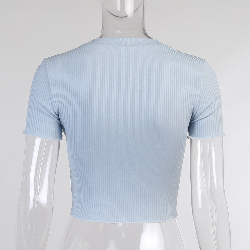 Summer New Round Neck T-Shirt Top Women Short-Sleeved Slim Blouse Solid Temperament Single-Breasted Women's T-Shirts Short Tops