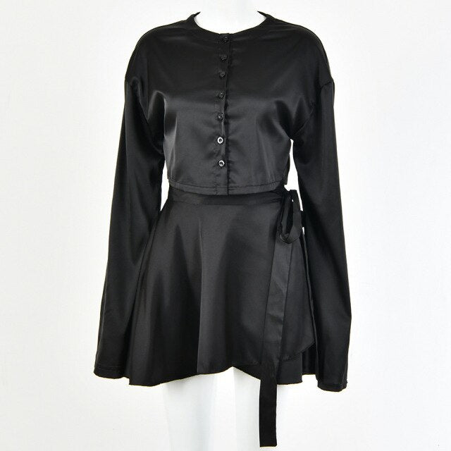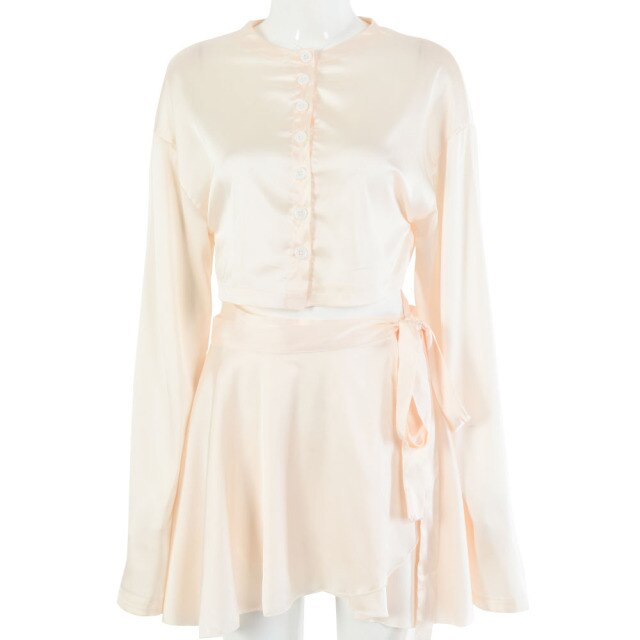White Elegant Satin 2 Two Piece Set Women Lantern Long Sleeves Crop Tops Cardigan Sexy High Waist Mini Tennis Sports Skirts 2022