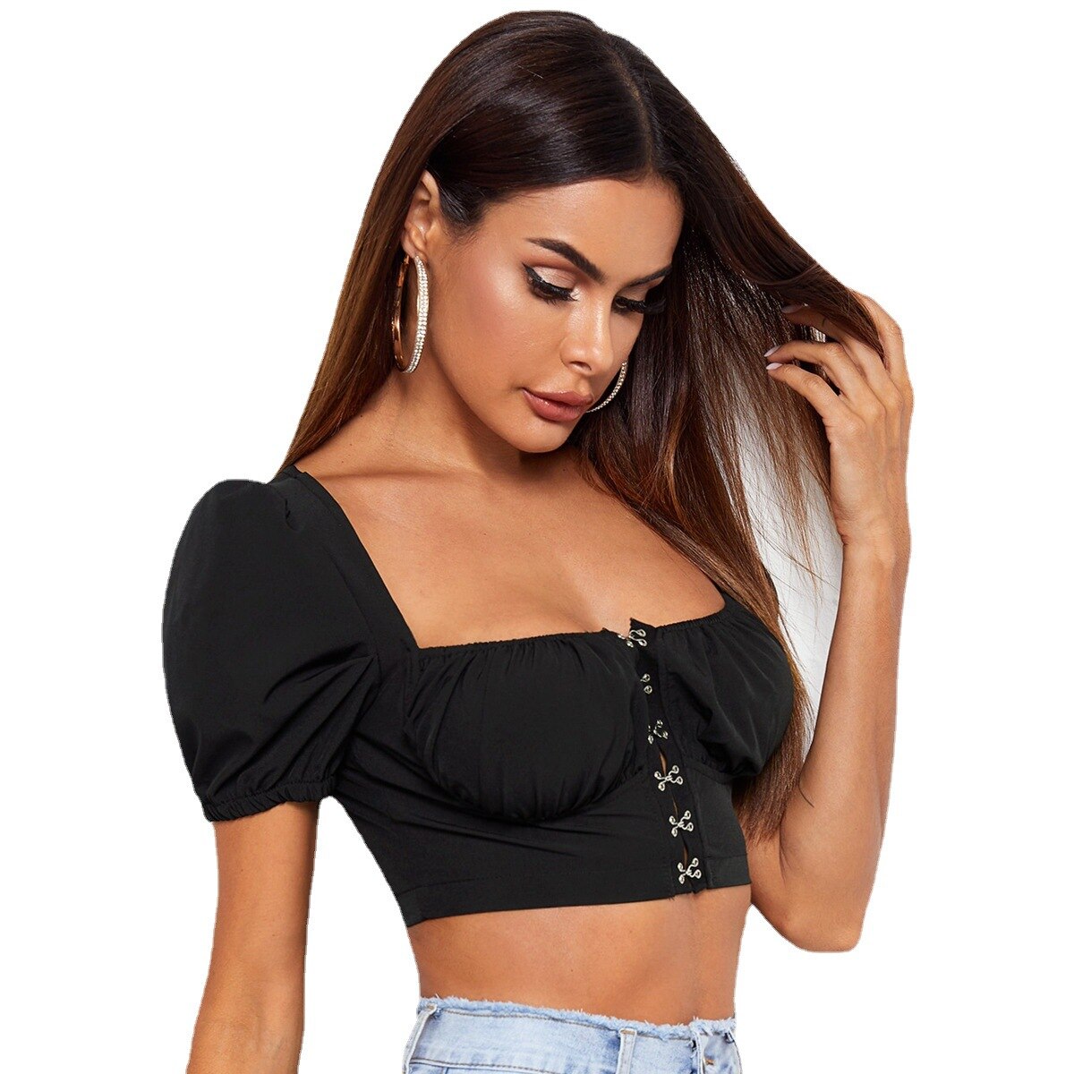 Women's Bottoming Tube Top Bubble Sleeve Square Collar Hook Design Navel Short T-shirt Top