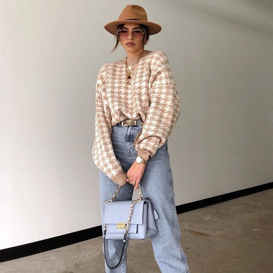 Women Casual Houndstooth Ladies Pullover Sweater Female Autumn Winter Retro Jumper Female Geometric Khaki Black knitted Sweater