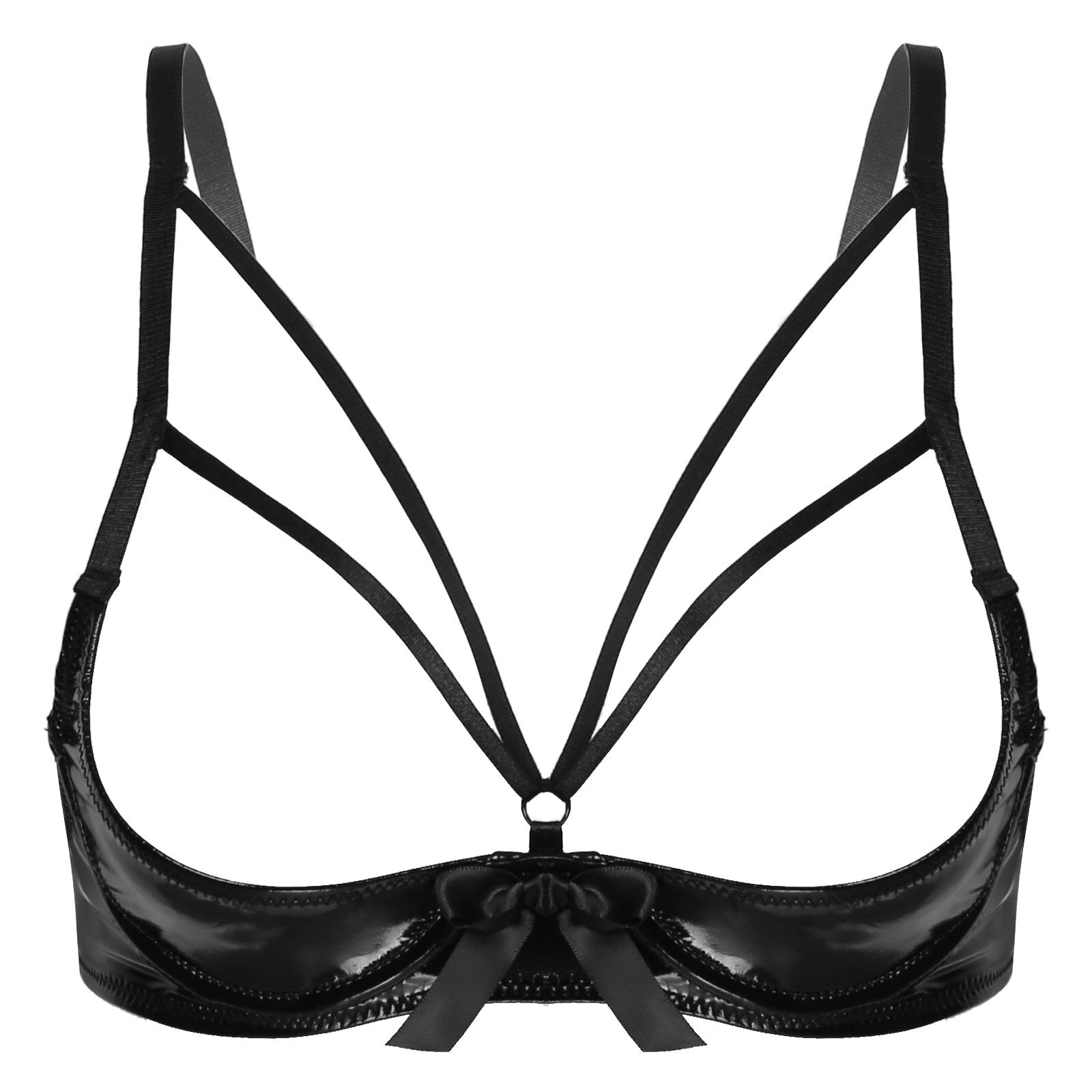 Women Strappy Open Cup Patent Leather Bowknot Underwired Bra Tops.