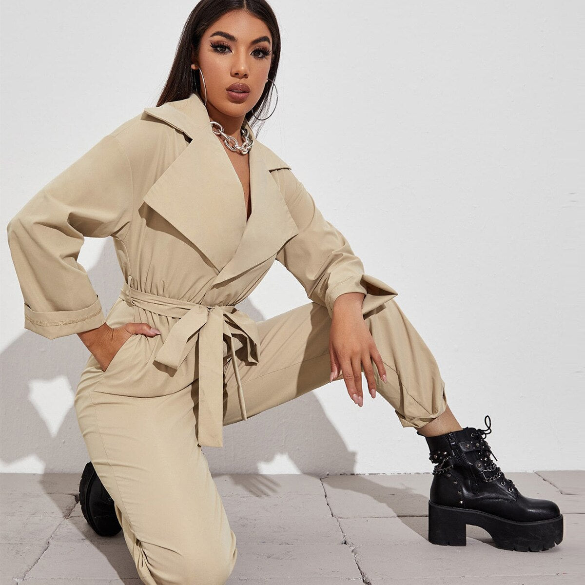 Women High Waist Slim Straight Tube Lace Up Jumpsuit with Belt Long Sleeve Casual Jumpsuit Women Elegance