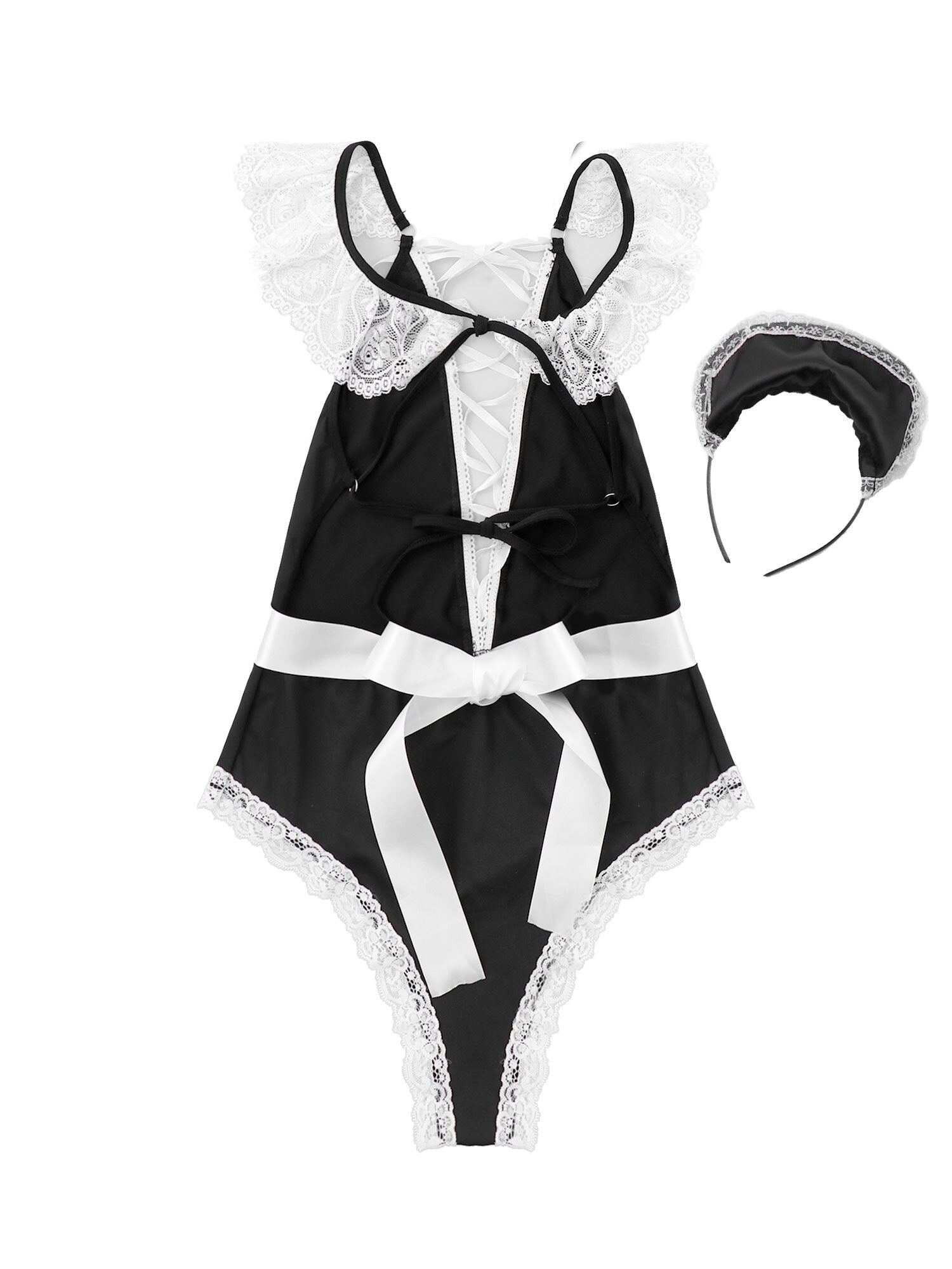 3Pcs Women Maid Cosplay Costume Straps Self Tie Back Hollow Out Front Lingerie with Apron and Hair Hoop Set.