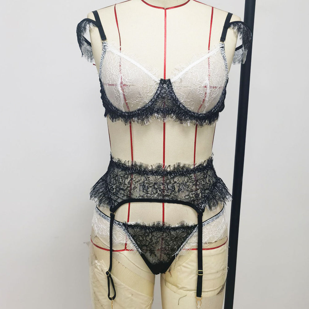 Women Patchwork Sexy Mesh Lingerie Set Garter Lace Hollow Out Bra Sex Thong Transparent Temptation Erotic 3 Piece Underwear Set