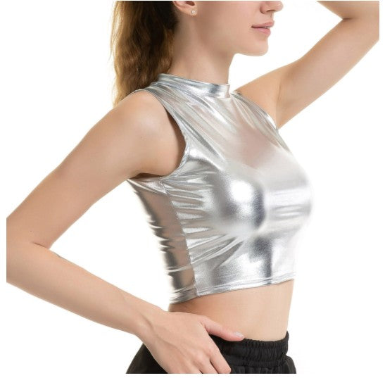 Fashion Metallic Shiny Sleeveless Crop Top Crew Neck T-shirt Vest Tops for Women.