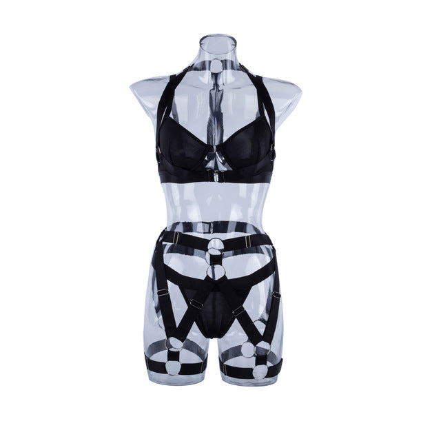 Women Sexy Lingerie 4 Pieces Set with Garters Bra and Briefs Hollow Out Transparent Erotic Costumes Sensual Underwear Outfits