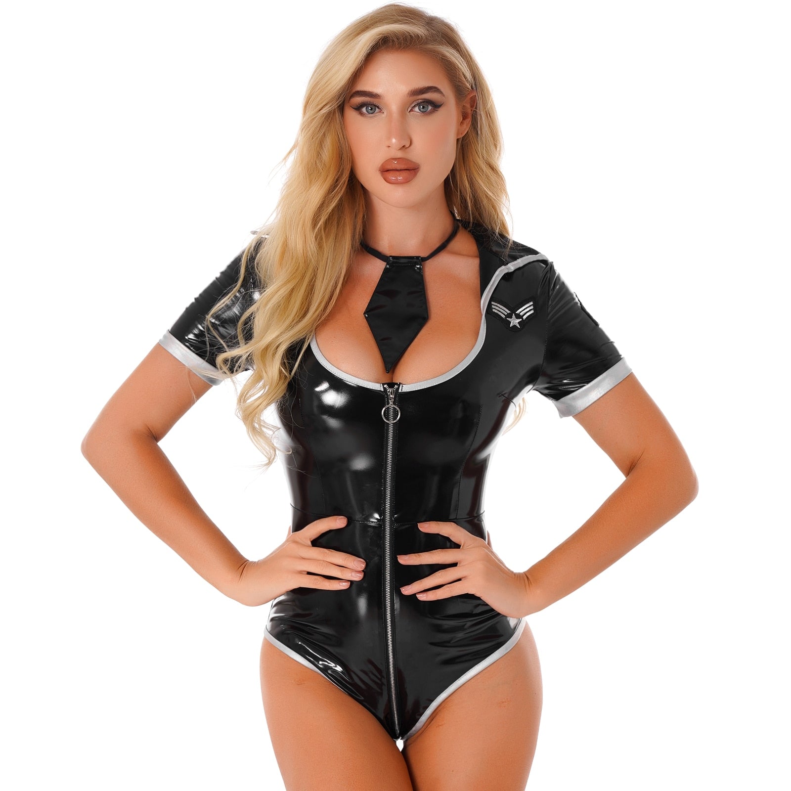Womens Police Role Play Costume Glossy Patent Leather Short Sleeve Bodysuit with Necktie.