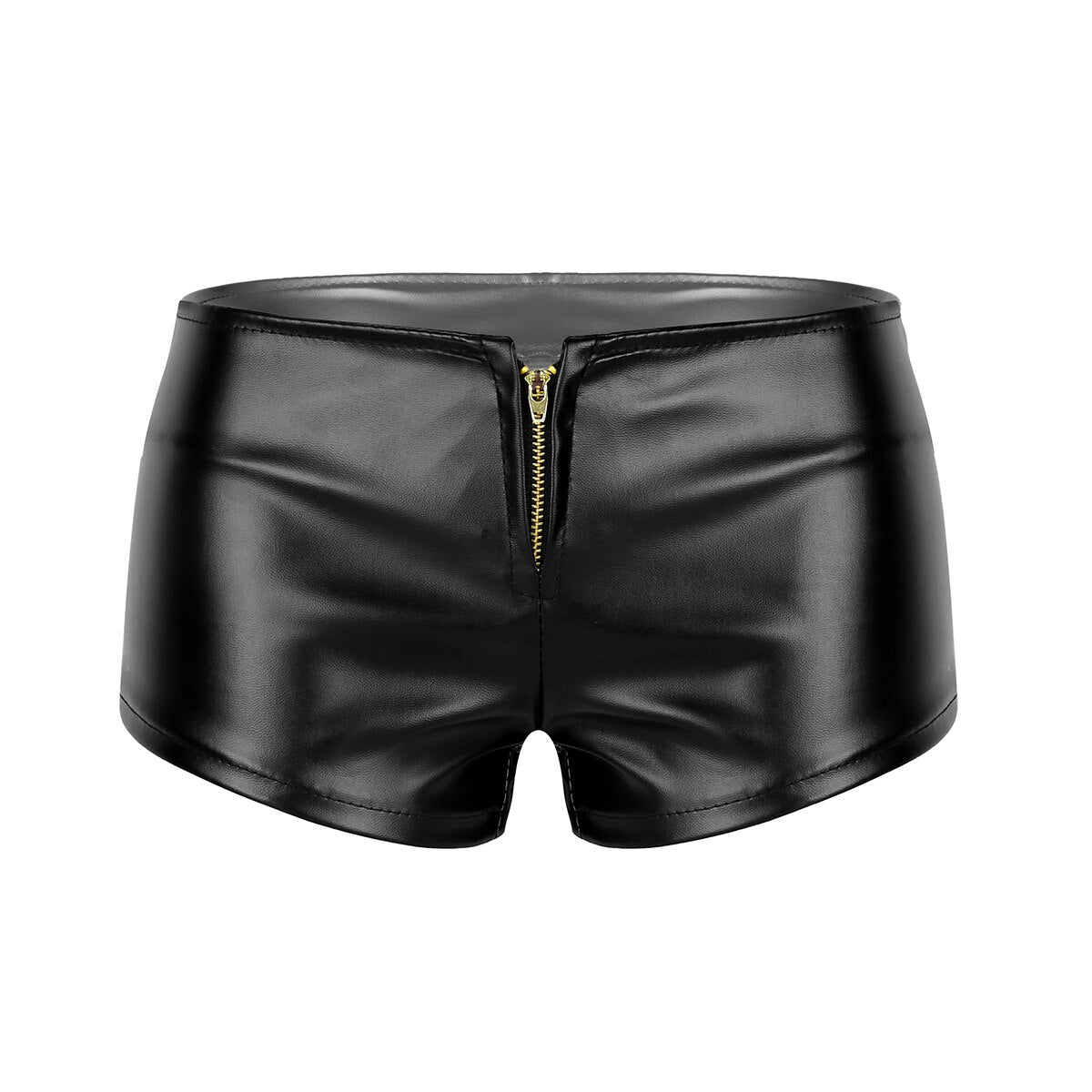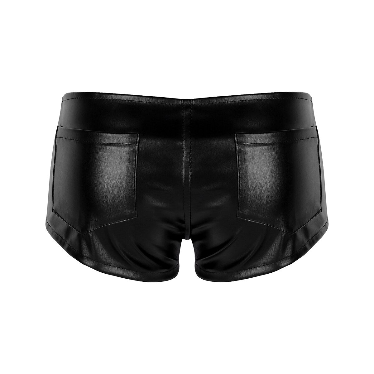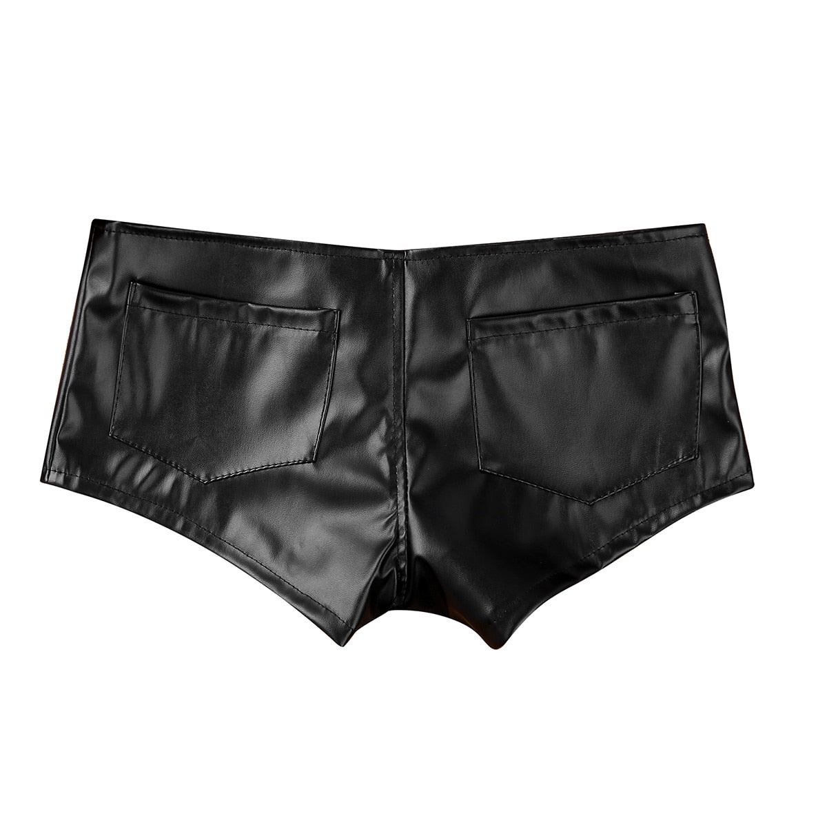 Women’s wet look faux leather mini shorts hot pants, slim cut.