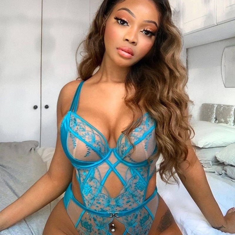 Women Sexy Sensual Lingerie Bodysuit Underwear Erotic Lace Embroidery Hollow Out Mesh Bra with Garters Set Exotic Costumes