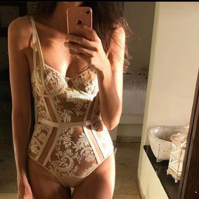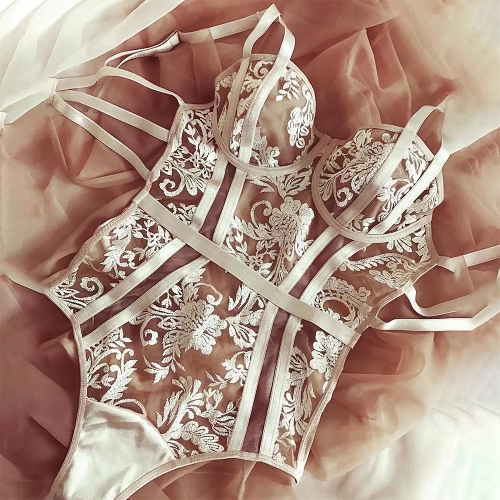 Women Sexy Sensual Lingerie Embroidery Bodysuit Underwear Erotic Lace Fetish Hollow Out Mesh Bra Bondage Jumpsuit Exotic Costume