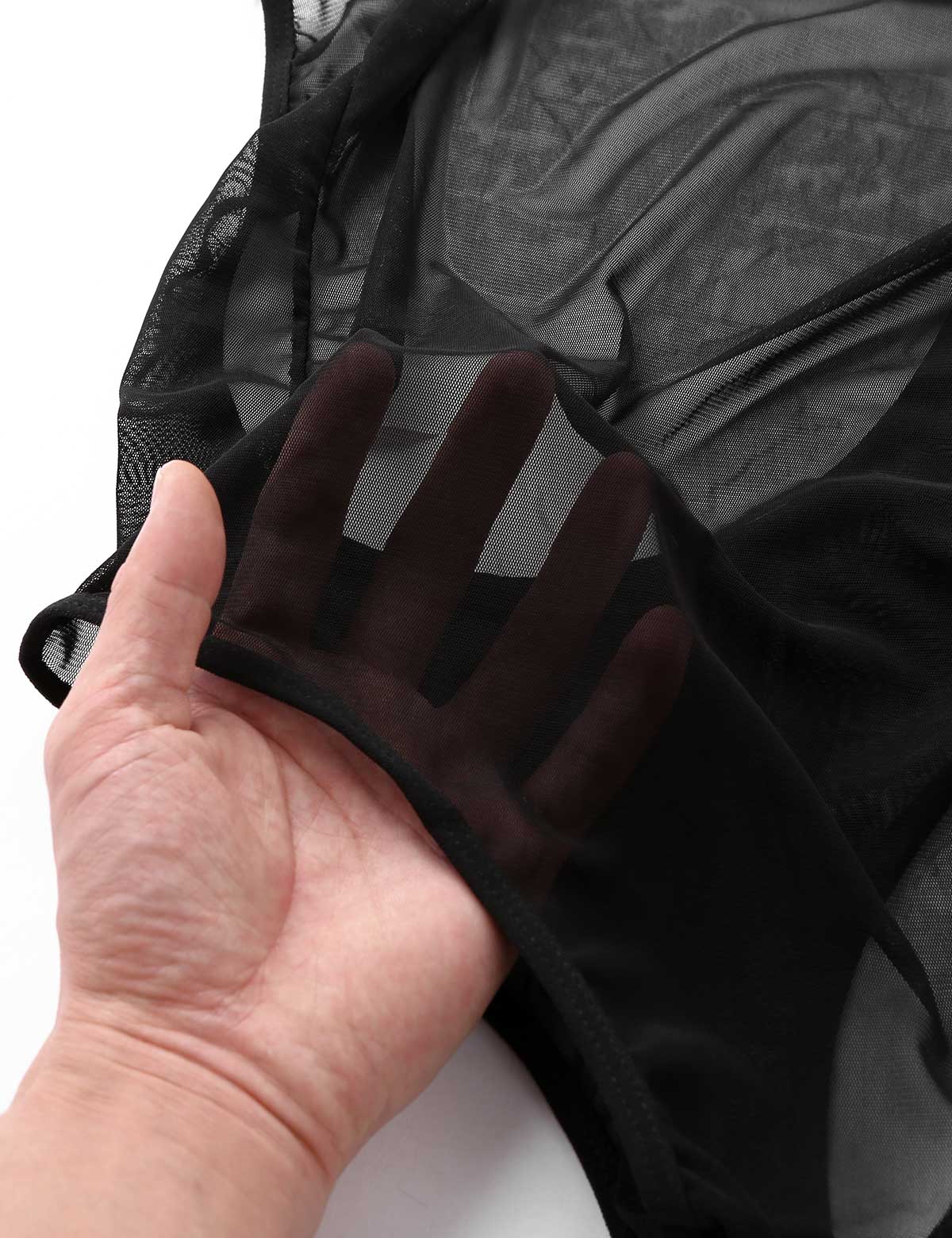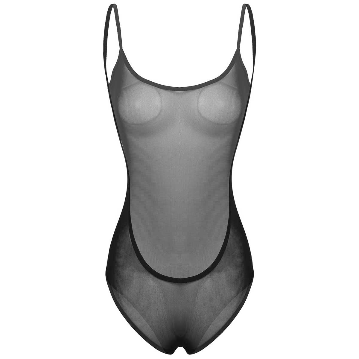 See-through sheer mesh design with spaghetti shoulder straps, deep u neck and backless, solid color, pull on closure.