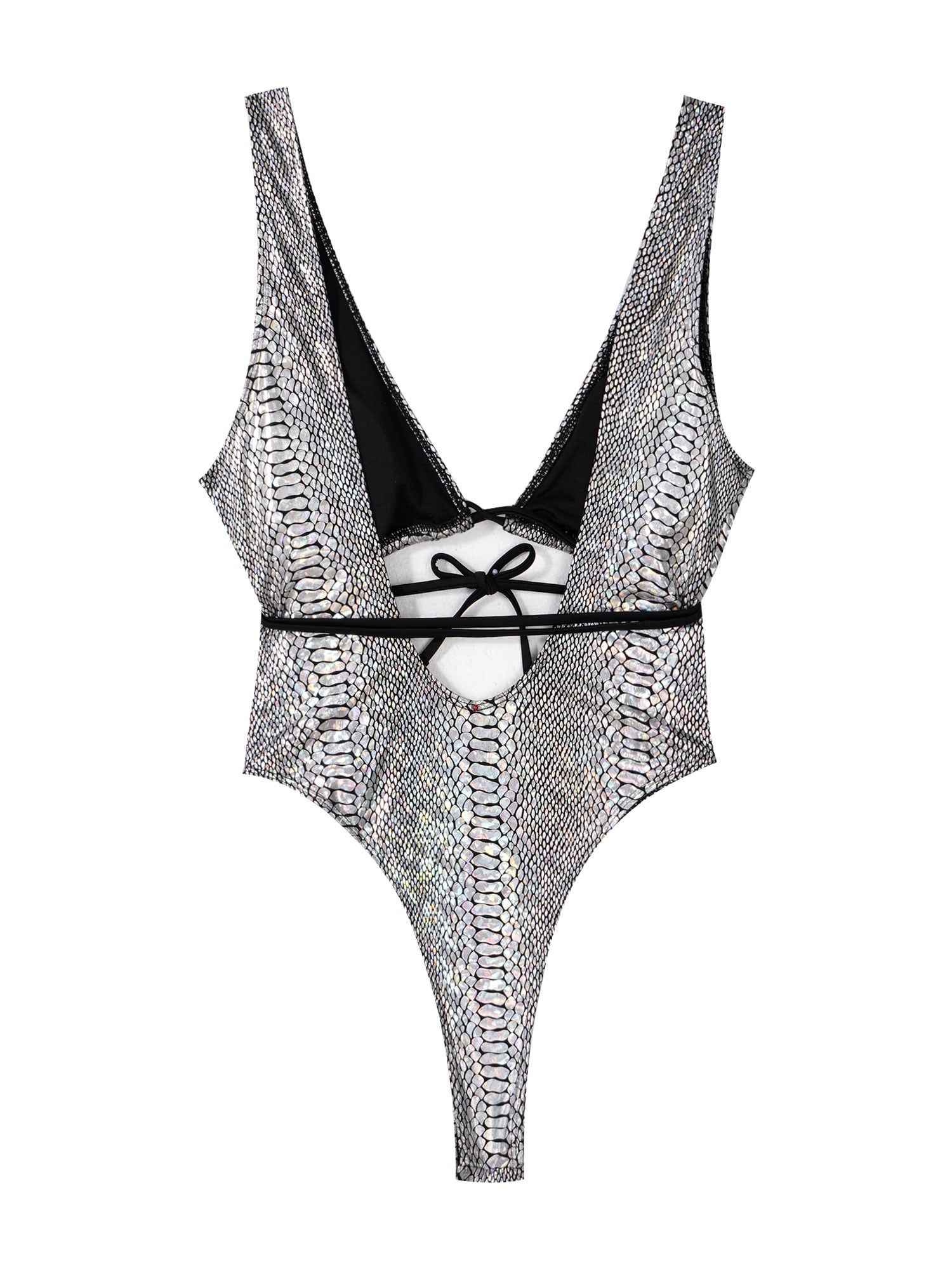 Women Shiny Snakeskin Print Sleeveless Bodysuit Removable Padded Lace-up Cutout Leotard Swimsuit.