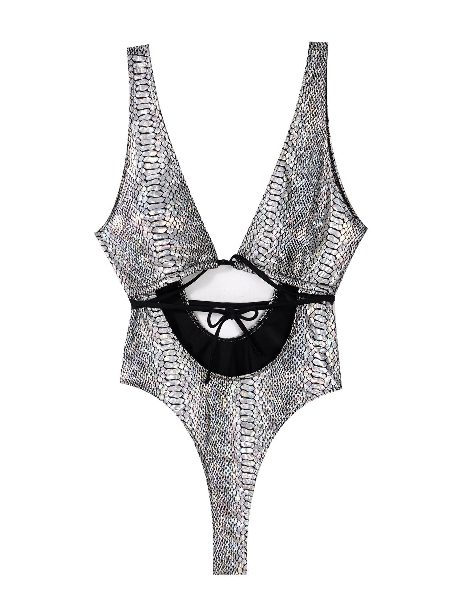 Featuring snakeskin print, lace-up, cutout, high cut, sleeveless, with removable pads.
