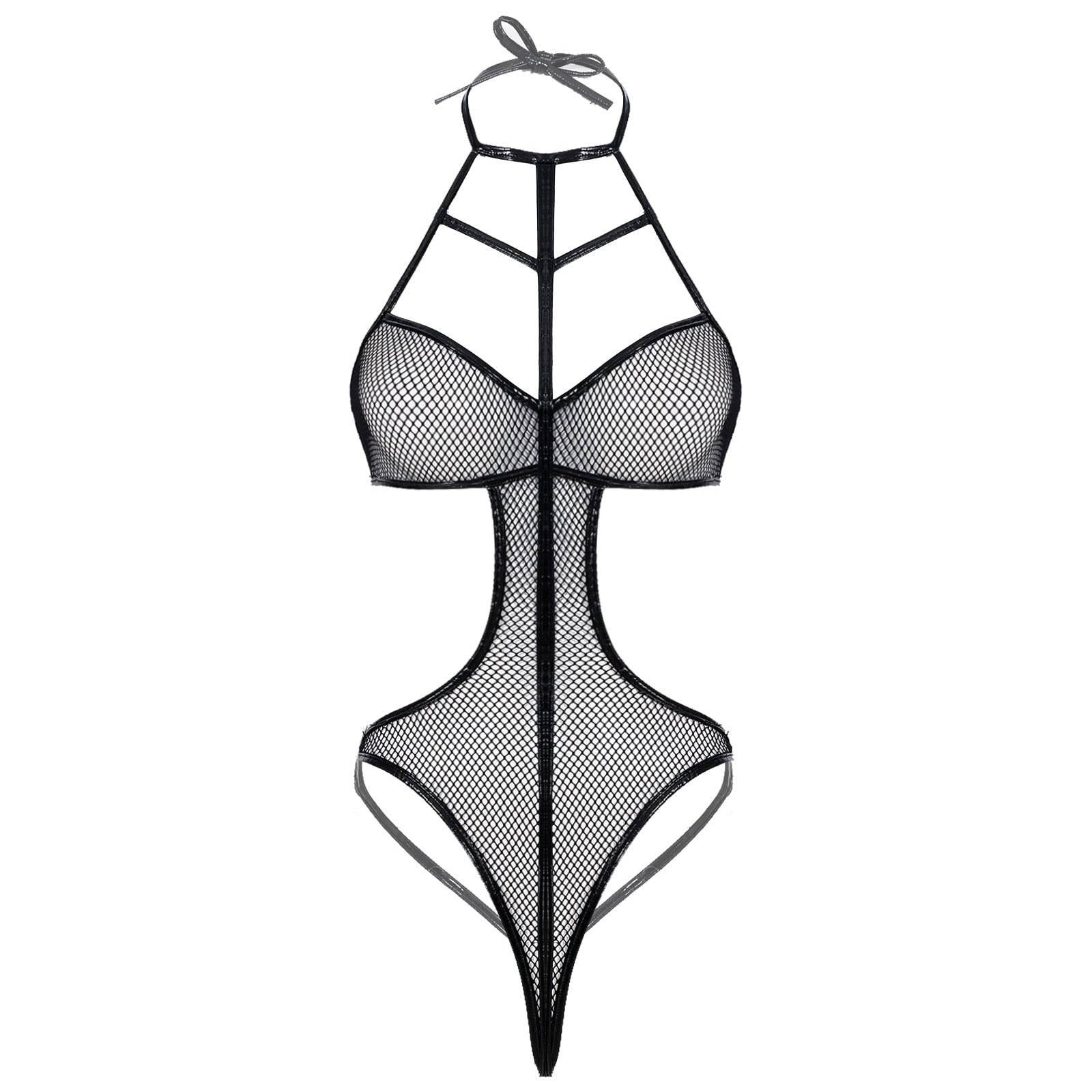 Women Strappy Hollow Out Fishnet Bodysuit Halter Lace-up See-through Mesh Leotard Cutout Catsuit.