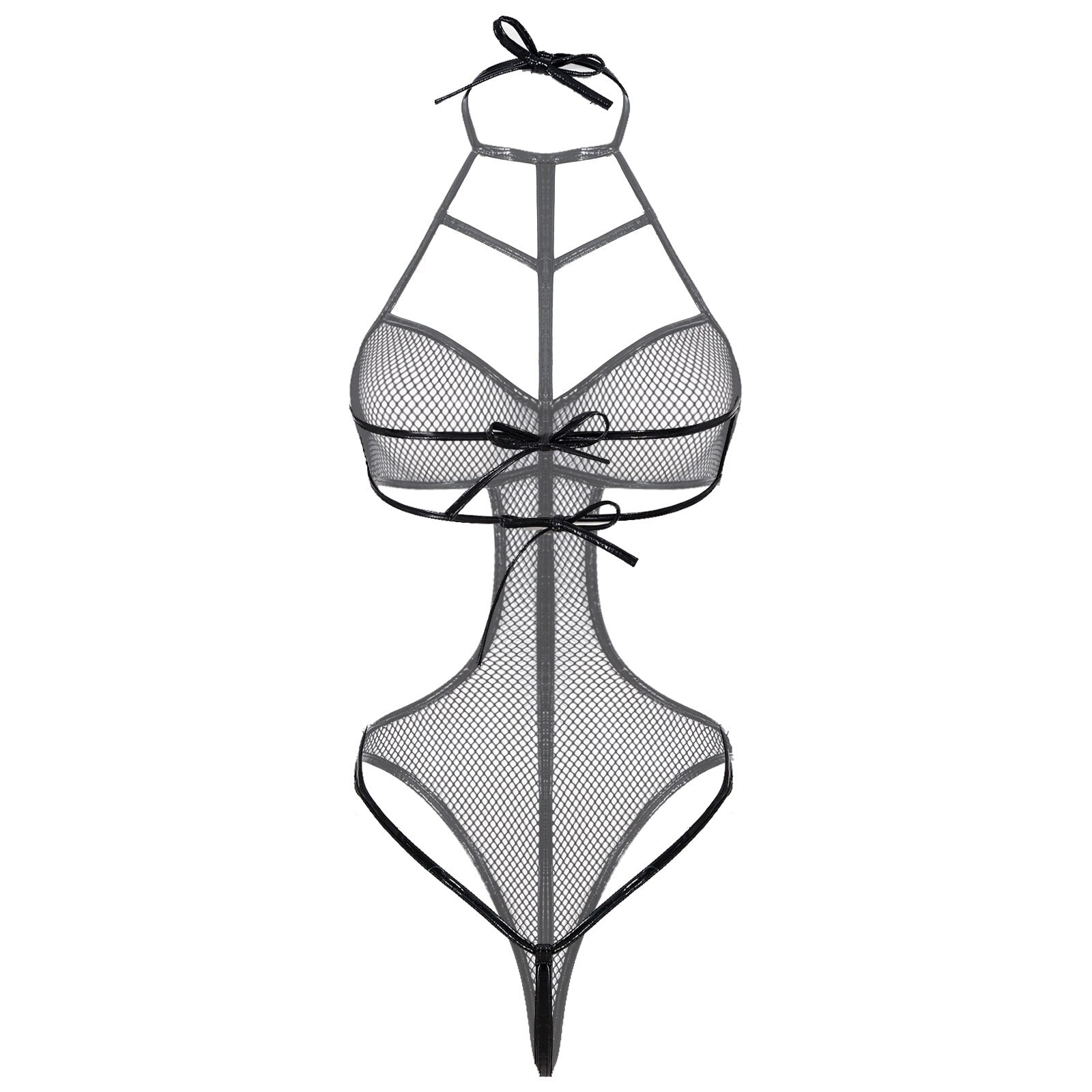 See-through hollow out fishnet, halter neck, lace-up, cutout design, sleeveless, backless.