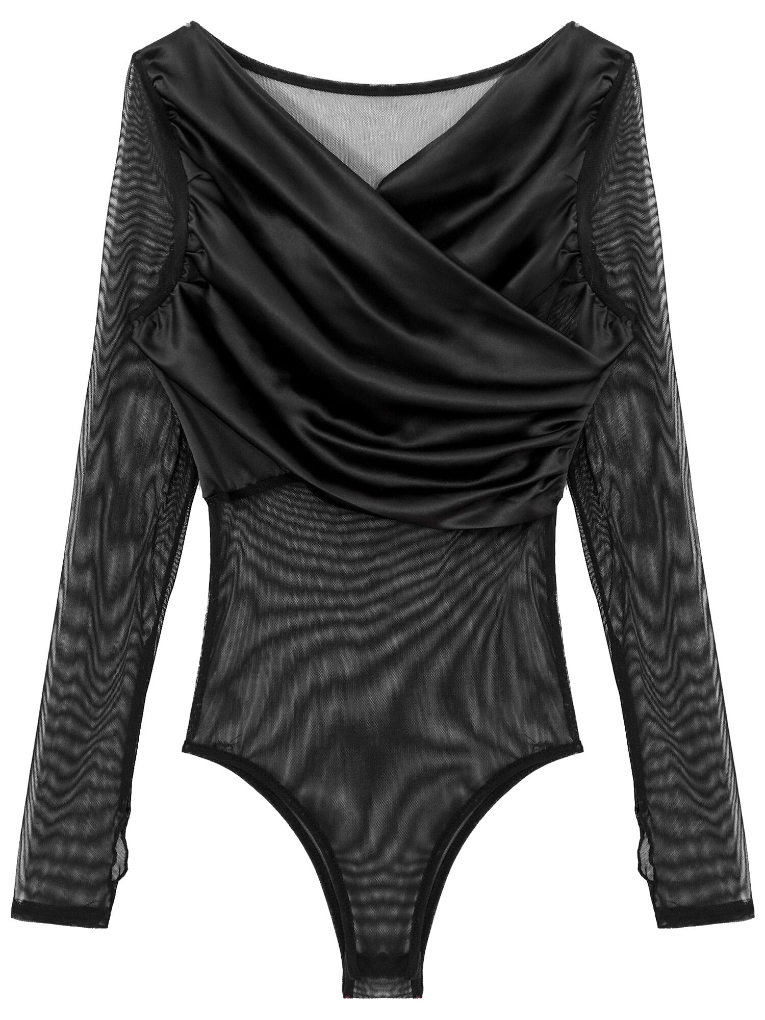 The sexy bodysuit features with long sleeve, irregular wrapped v neck, sheer mesh spliced with satin, making you look charming and sexy.