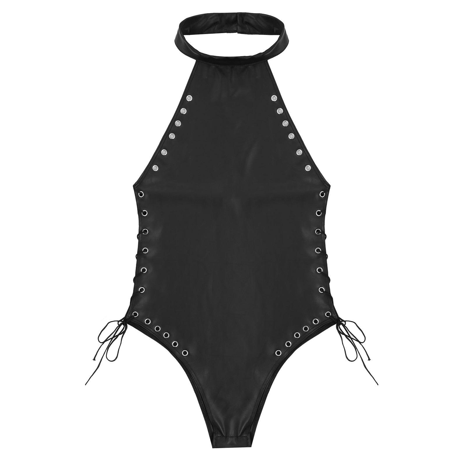 Women Fashion Halter Neck Lace-up Bodysuit Hollow Out Backless Patent Leather Leotard Sleeveless Jumpsuit.