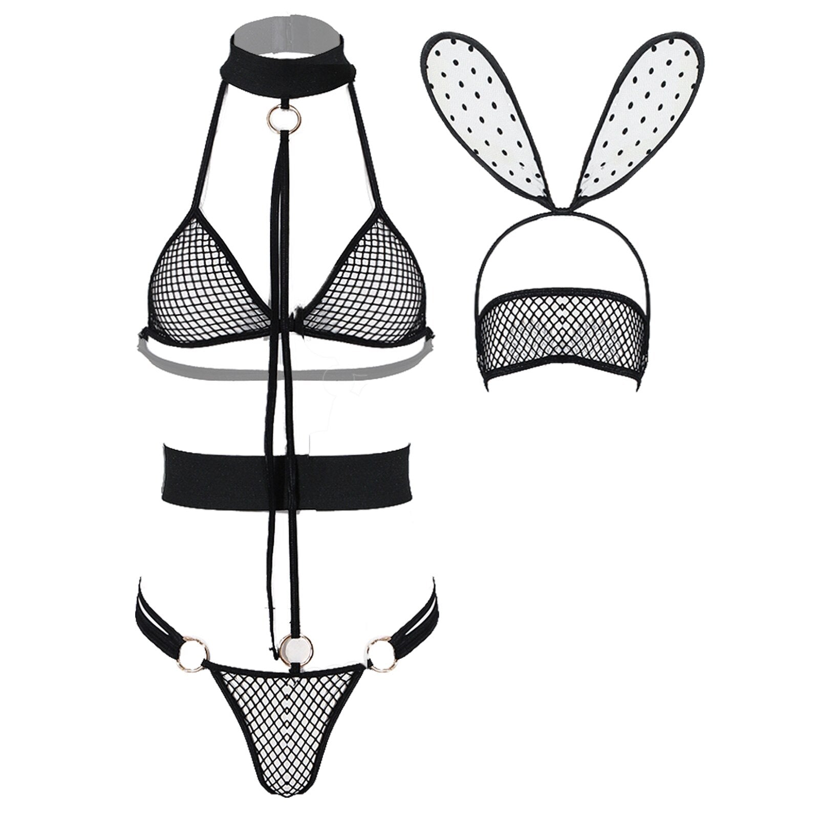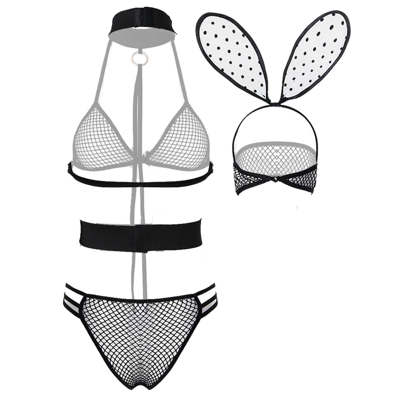 Women Halter See-through Fishnet Bodysuit Honeymoon Gift Hollow Out Leotard with Rabbit Ears Eye Mask.