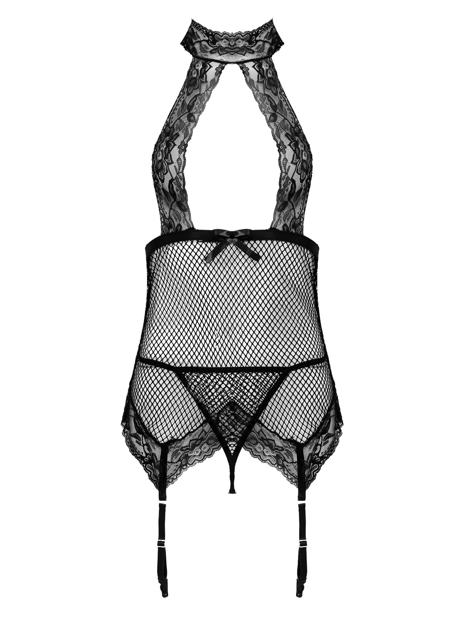 See-through net, halter lace up, open back, pair with thong and suspender garter belts.