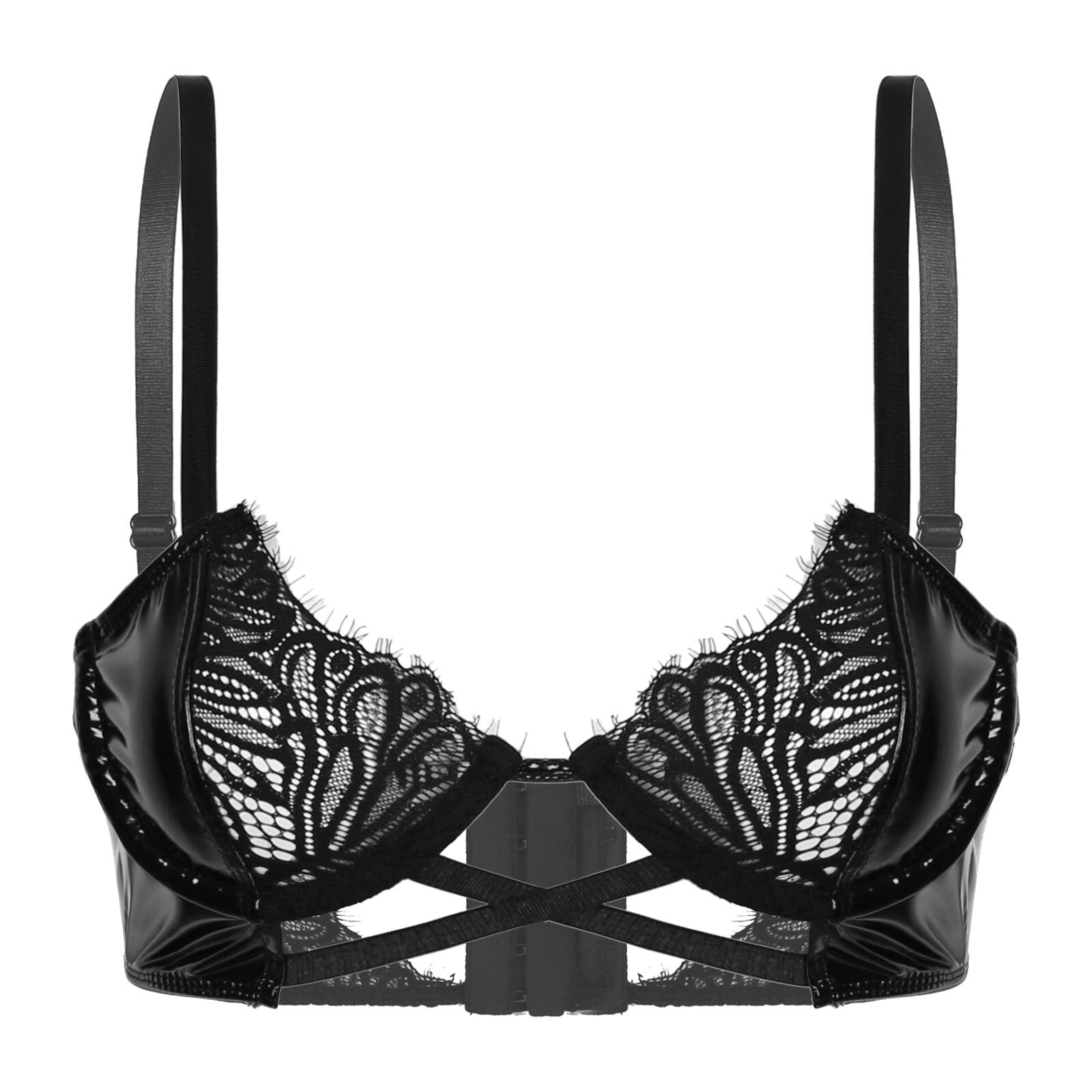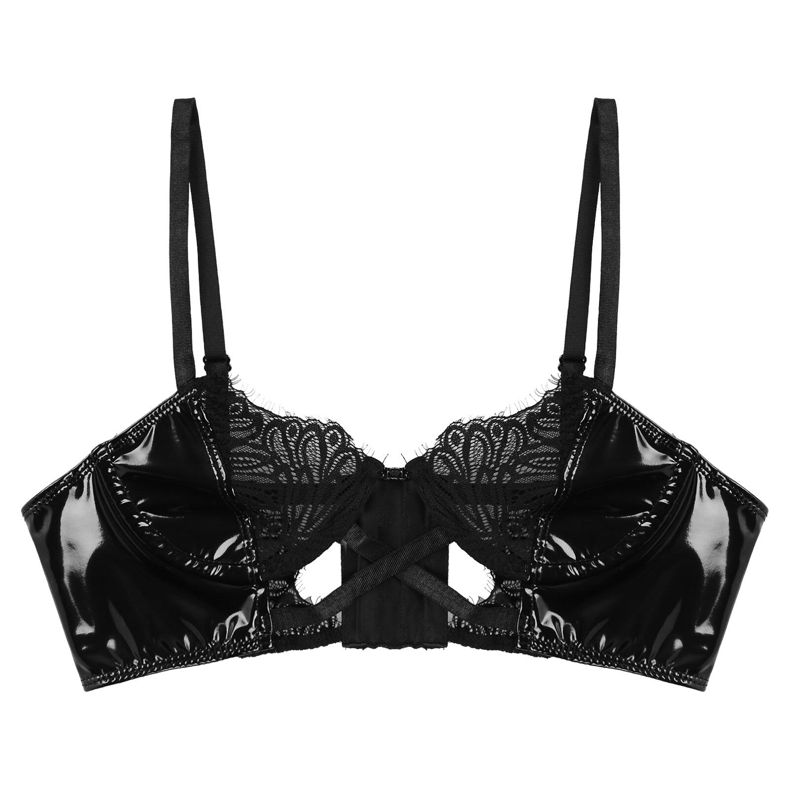 Women Wet Look Patent Leather Lace Patchwork Underwired Bra Tops.