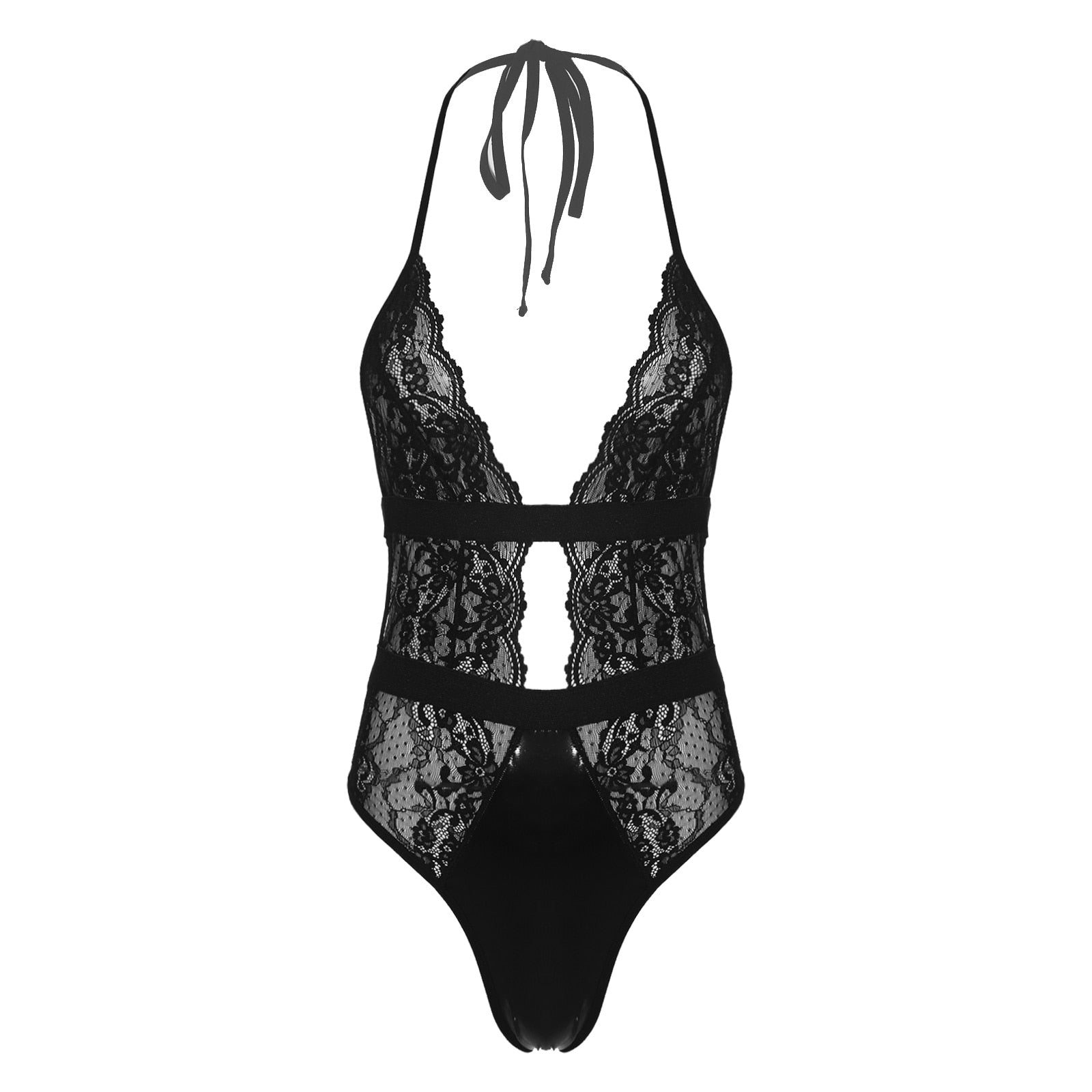 Women Plunging Neckline Halter Lace-up High Cut Bodysuit Patent Leather Patchwork See-through Lace Leotard Catsuit.