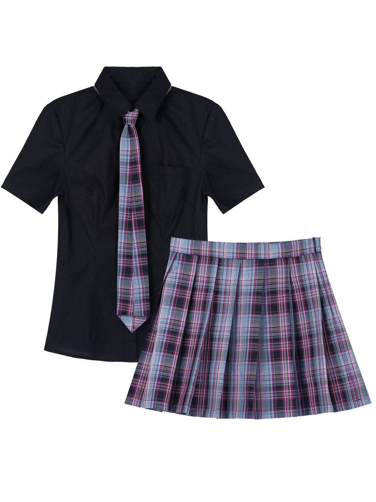 Women Schoolgirl Uniform Outfits Short Sleeve Button Down Shirt with Plaid Pleated Skirt Bow Tie.