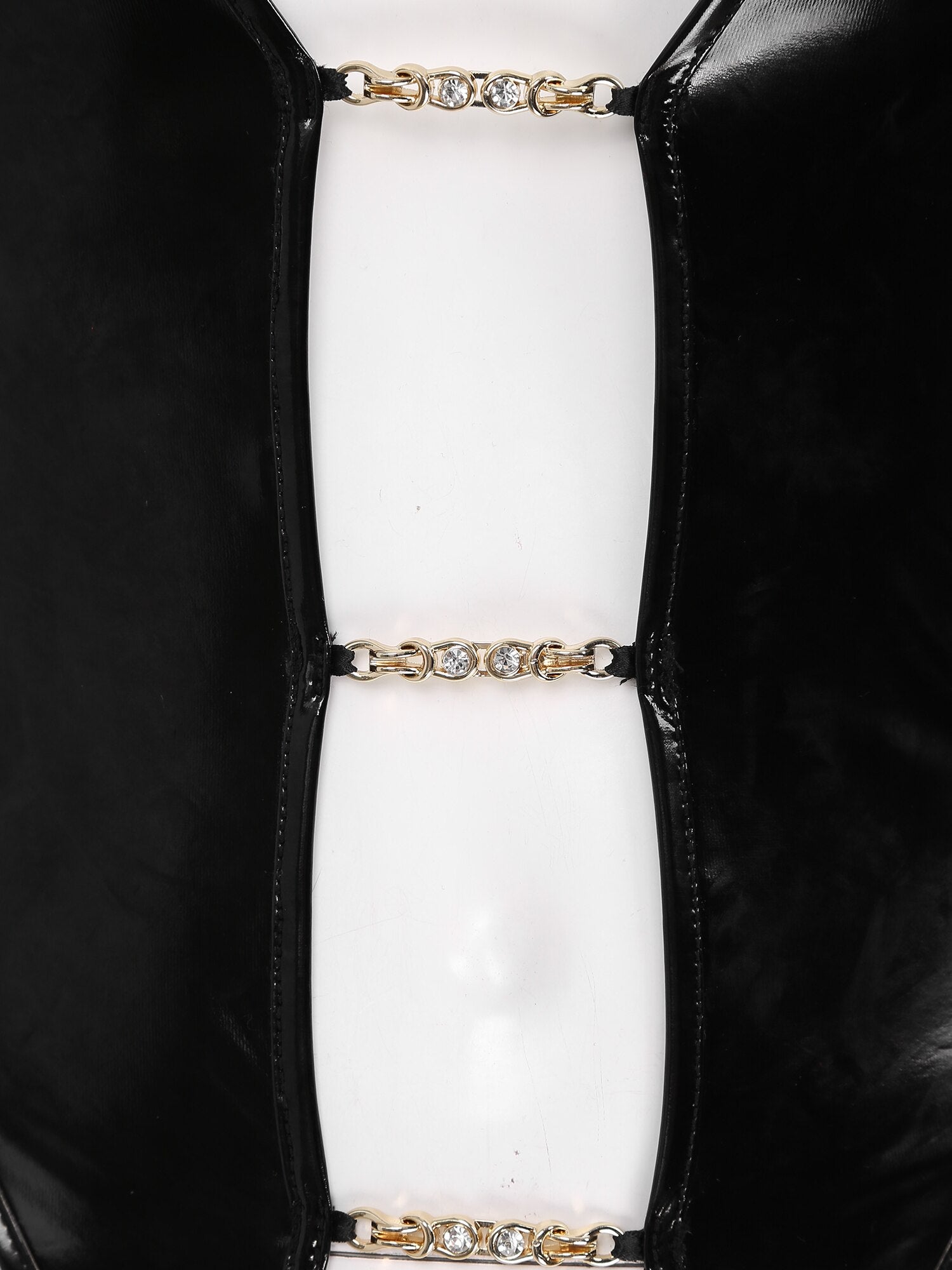 Front with rhinestone metal clasp decor, back crisscross adjustable spaghetti straps.