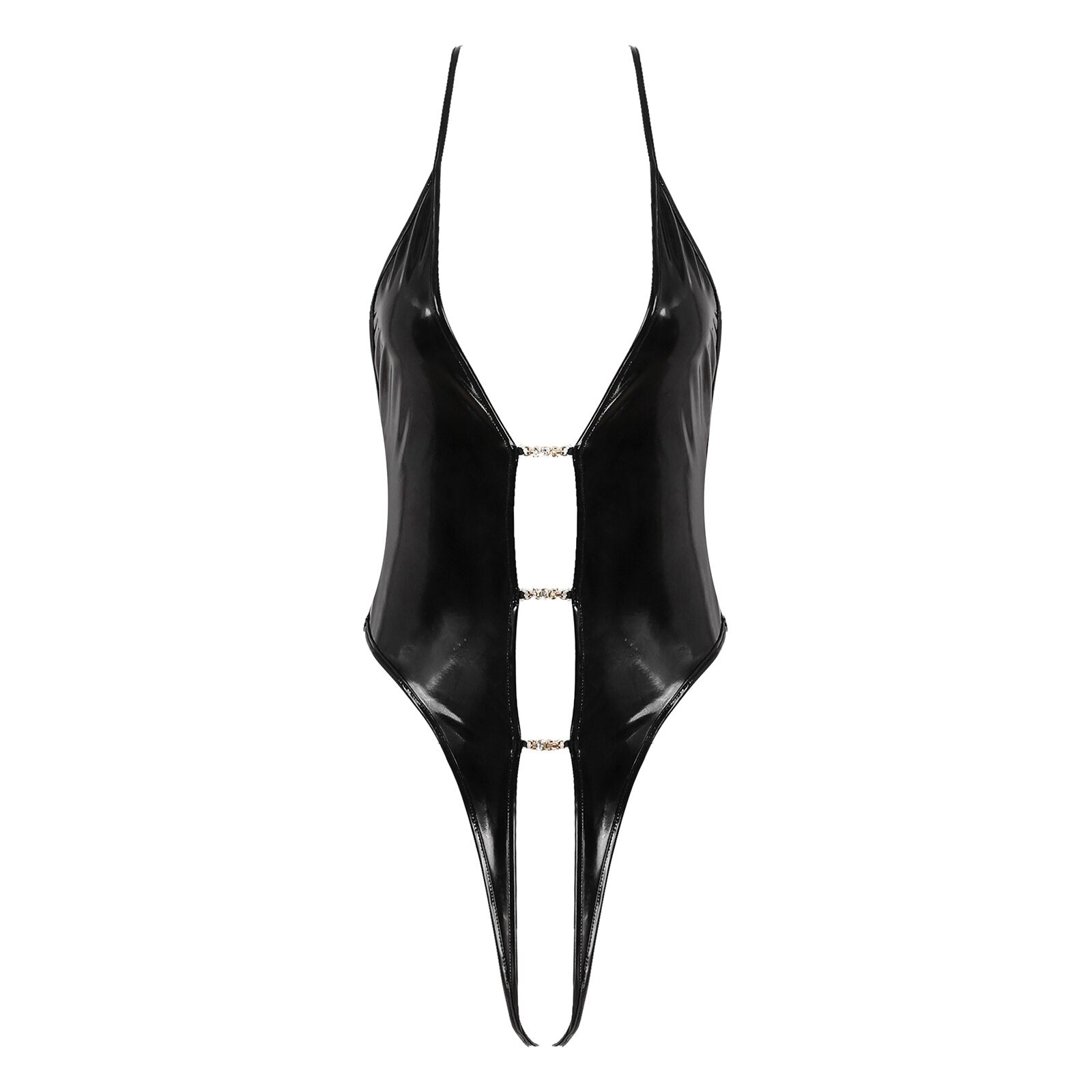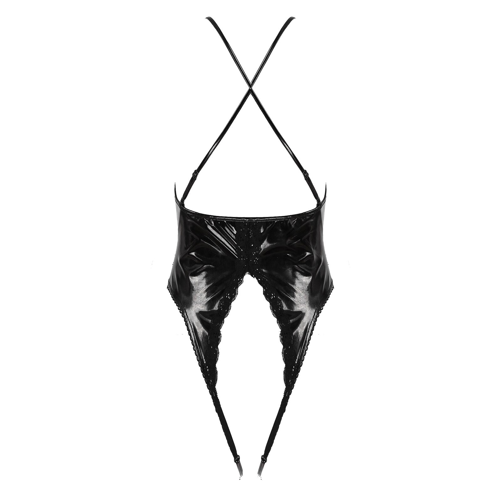 Womens Wet Look Patent Leather V Neck Bodysuit Spaghetti Straps Crotchless Catsuit.