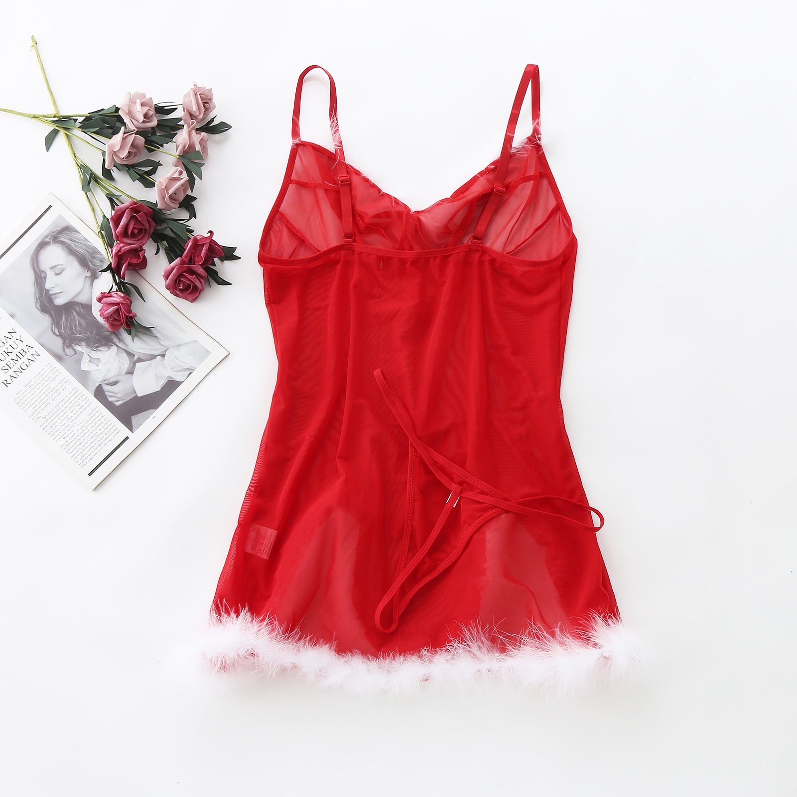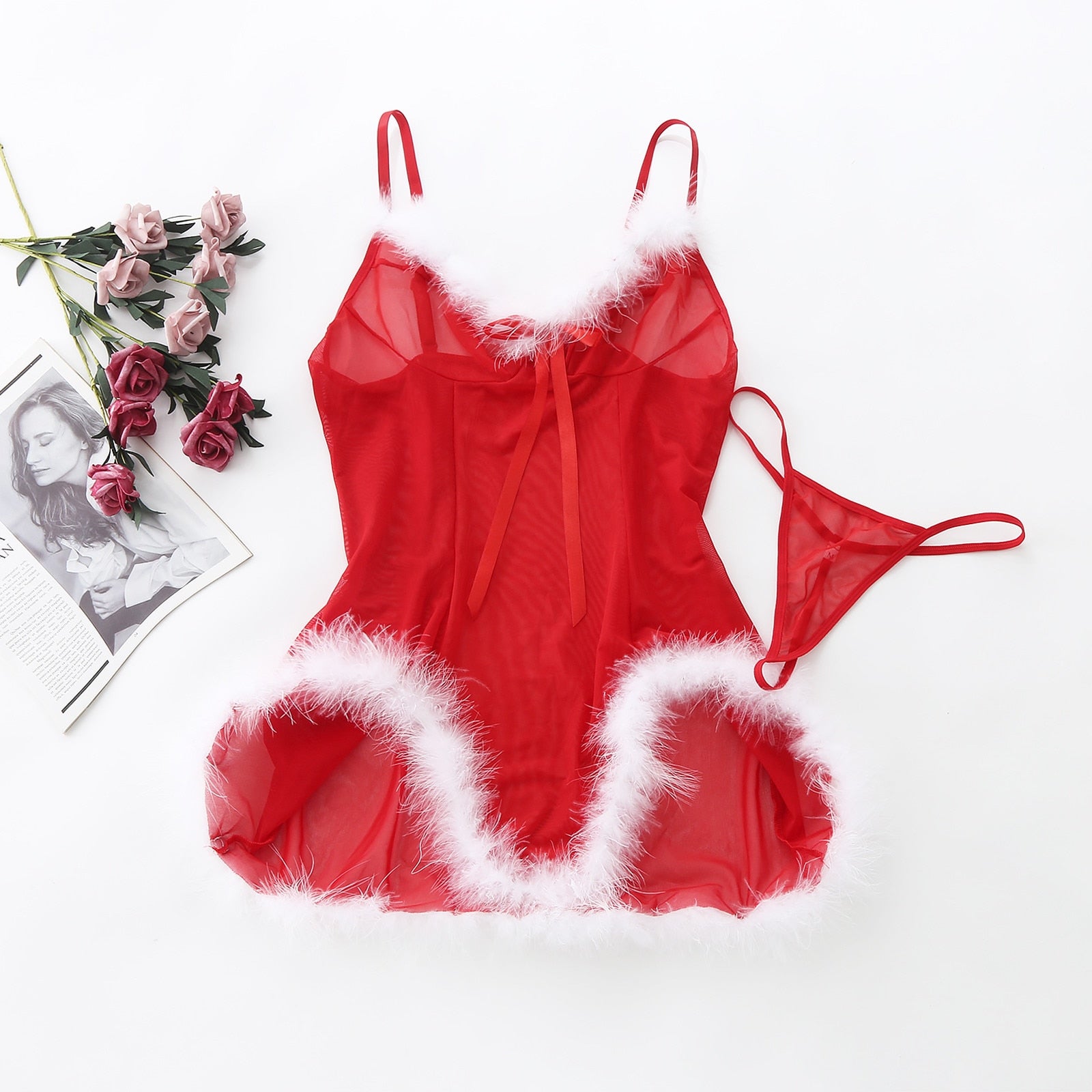 Christmas Erotic Dress for Women Sexy Feather V-neck Strap Night Dress Perspective Lace Sexy Underwear Erotic Lingerie Sleepwear