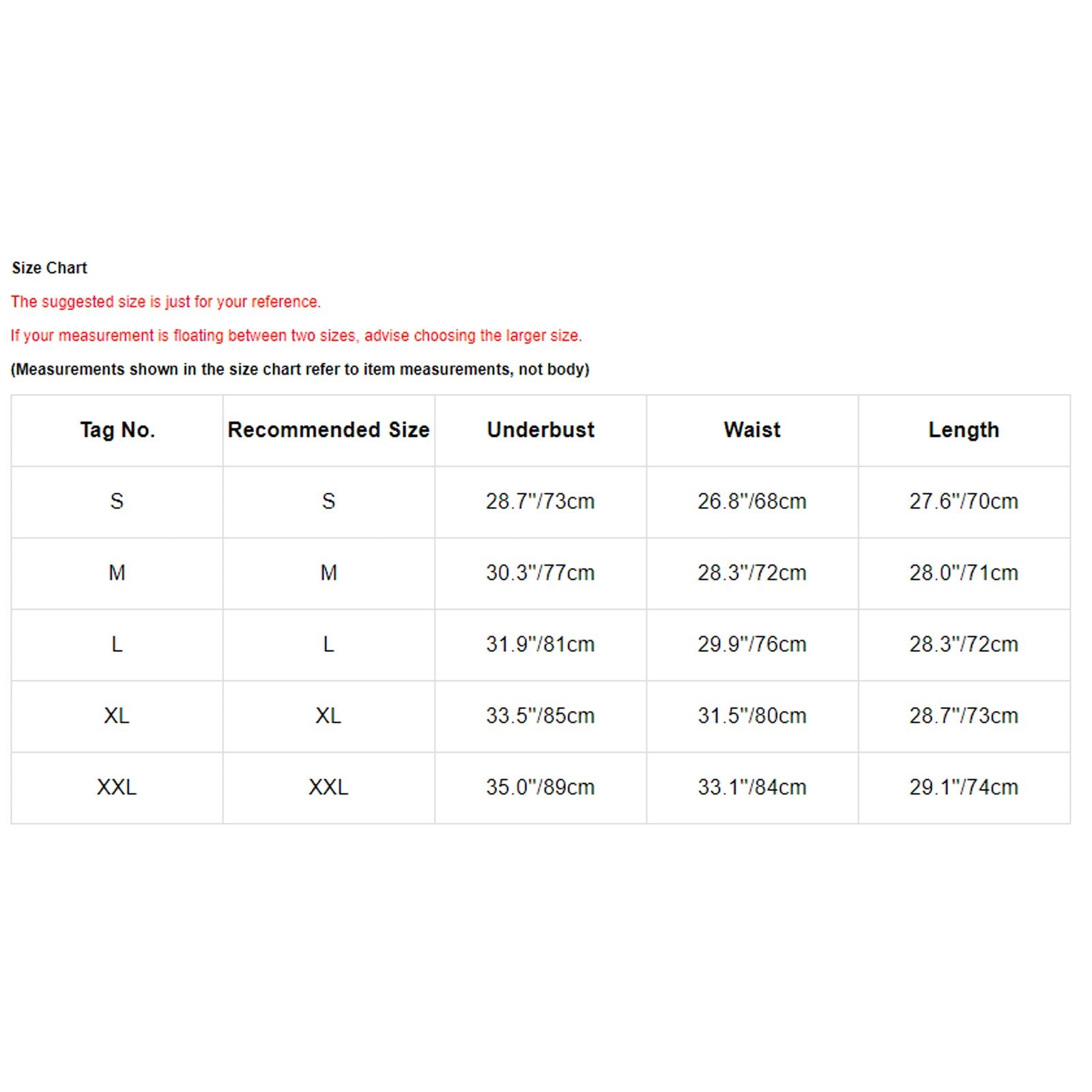 | Tag No. | Recommended Size | Underbust | Waist | Length |