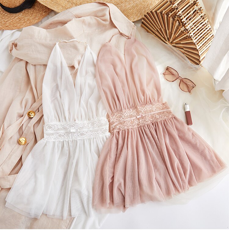 French Sexy Nightgown Fairy Lace Pajamas Gauze Backless Sleepwear Female Halter Neck Ultra Short Temptation Deep V Night Dress