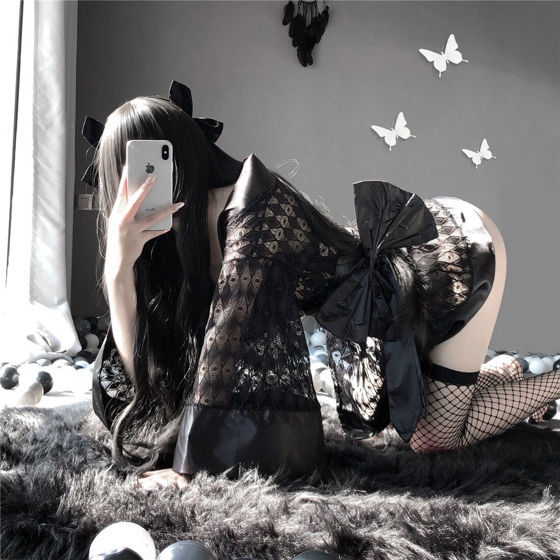 Japanese Kimono Sexy Bathrobe Harajuku Gothic Dark Black Sleepwear Lingerie Soft Girl Perspective Yukata Uniform Pajama Set
