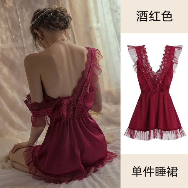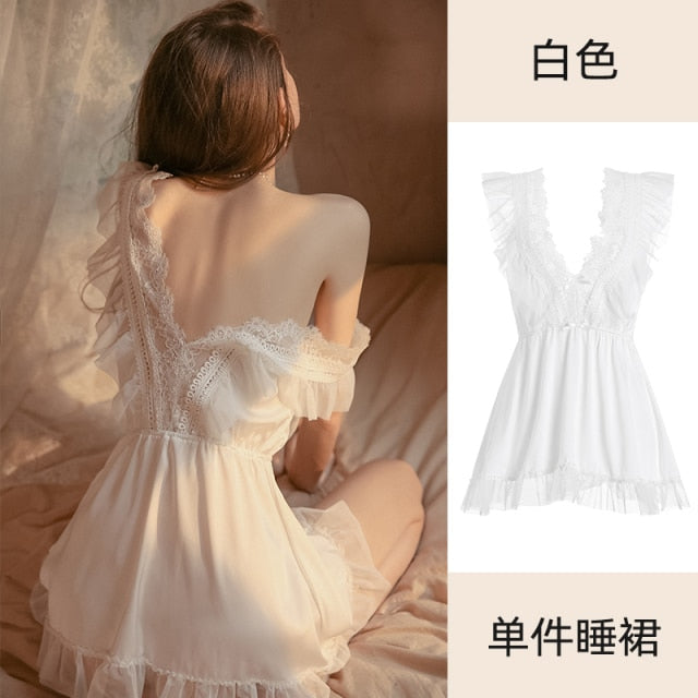Kawaii Lingerie Night Dress Women Sleepwear Sexy Nightwear Deep V Strapless Hot Lace Suspender Nightdress