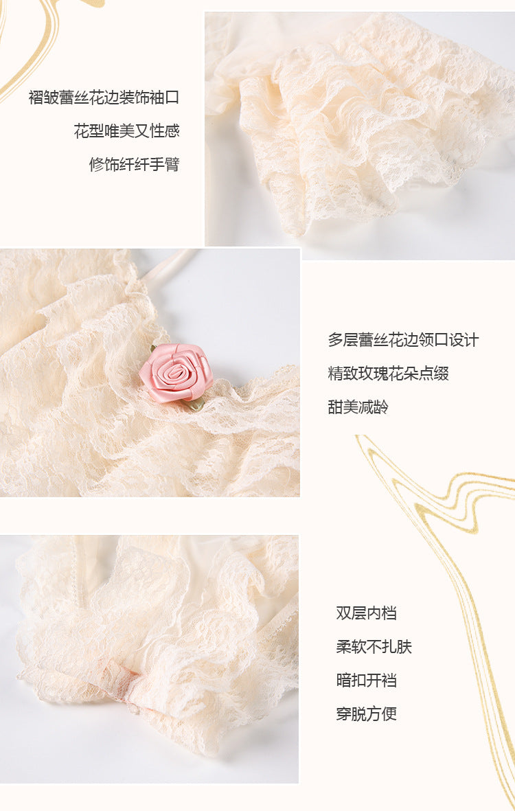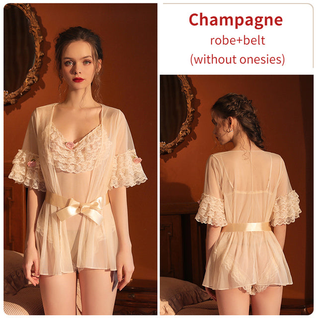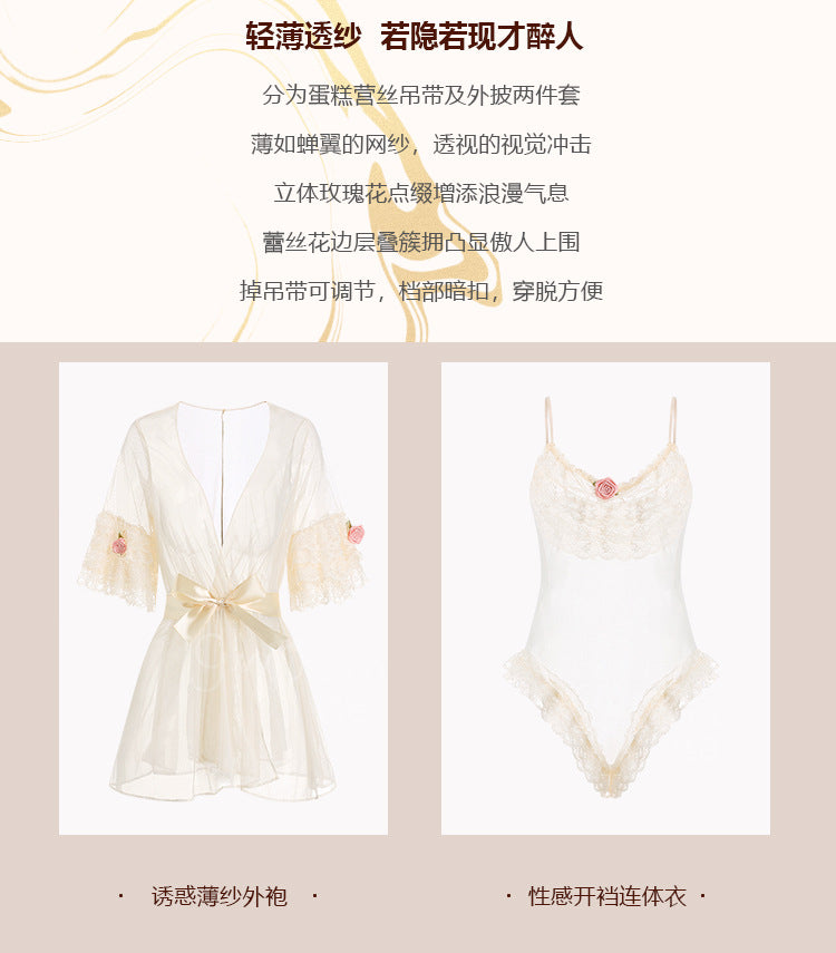 Lace Gauze Perspective Robe Onesies For Adults Women Sexy Lingerie Femme Sweet Cute Sleepwear Erotica Open Crotch Bodysuit