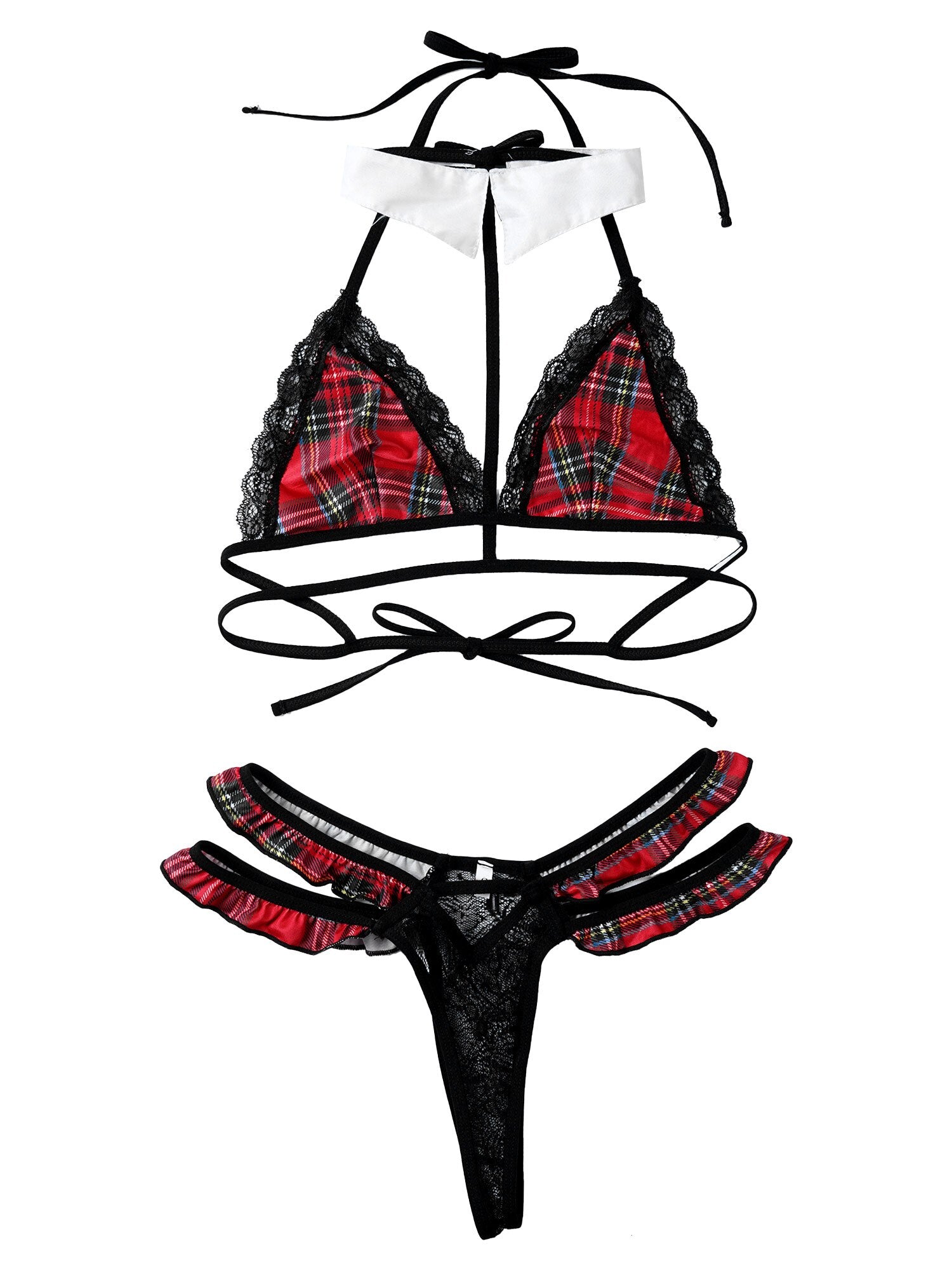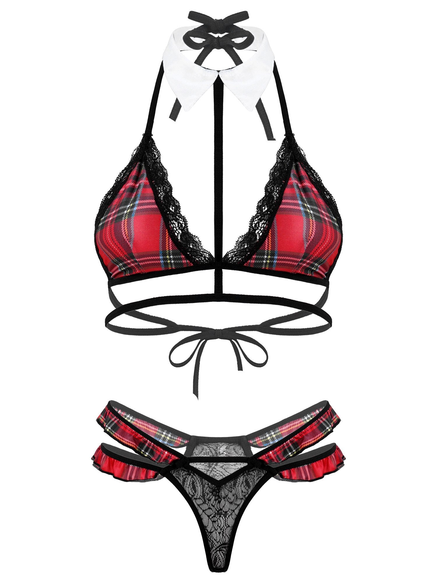 Women Plaid Strappy Lingerie Suit Lace-up Underwear Sleepwear.