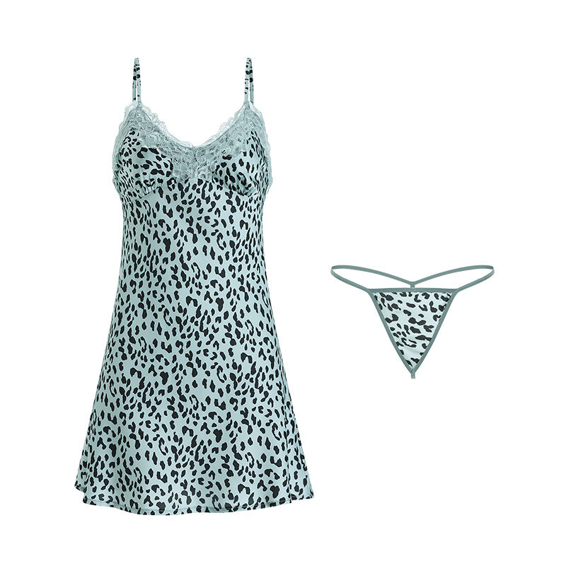 New women sexy nightdress lace satin ladies nightgown leopard suspender skirt thong V-neck sleepwear suit 1162 femme lingerie