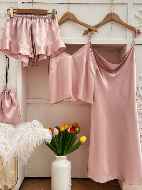 Pajama Set Women Pajamas for Women Silk Sleepwear Set Sleep Tops Summer Sexy Nightwear 3PC Suit Nightgown Nightie Home Clothes