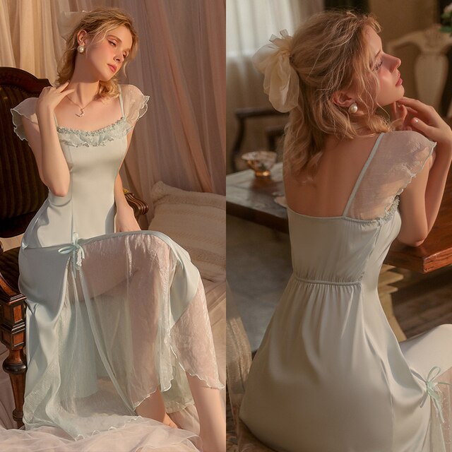 Satin Social Evening Dress Women French Elegance Long Robe Silk Sleepwear Party Lace Longuette Nightgown Camisole Pamajas Summer