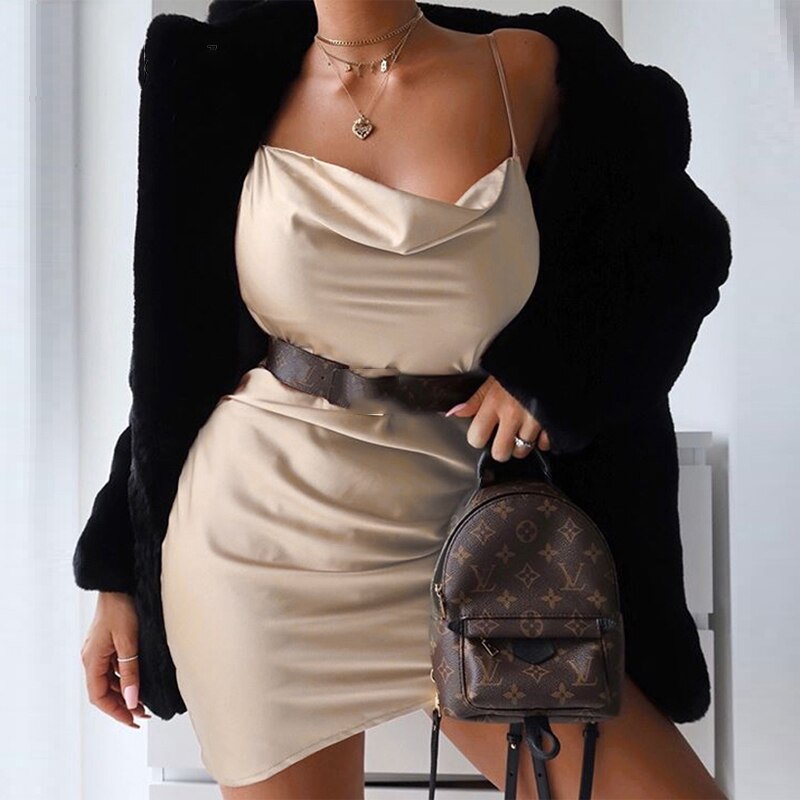 Sexy Champagne Satin Party Dress Night Club Women Sleeveless Summer Sundress Solid Bodycon Dress Female