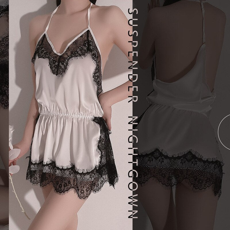 Sexy Halter Sling Nightdress Underwear Female V-neck Backless Lace Temptation Home Clothes Sleepwear Women Nightgown Silk Dress
