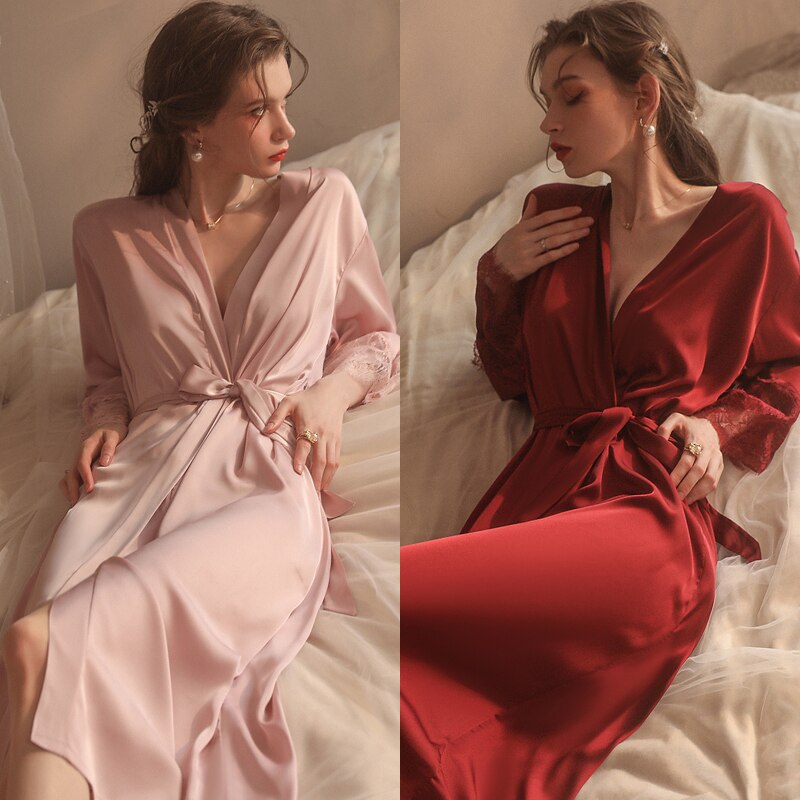 Sexy Lace Robes Sleepwear Women Satin Bathrobe Lingerie Sleeping Dress Nightgown Bathrobe Soft Home Wear Sleep Tops Summer 2022