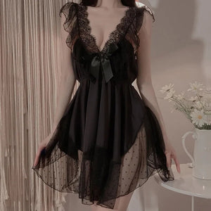 • Night Dress Women Sexy Lingerie Pajamas Summer Thin Lace Suspenders Nightdress V-Neck Fashion Dress Pure Desire Wind Home Wear