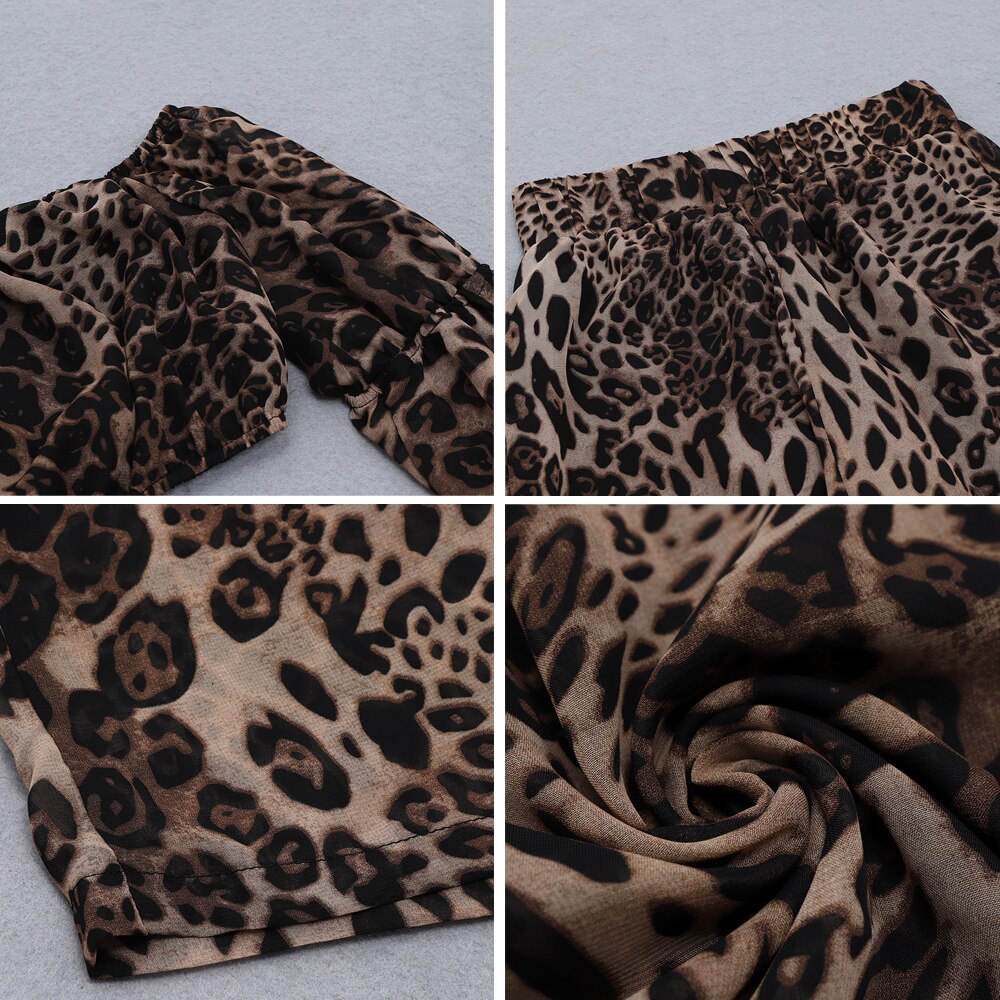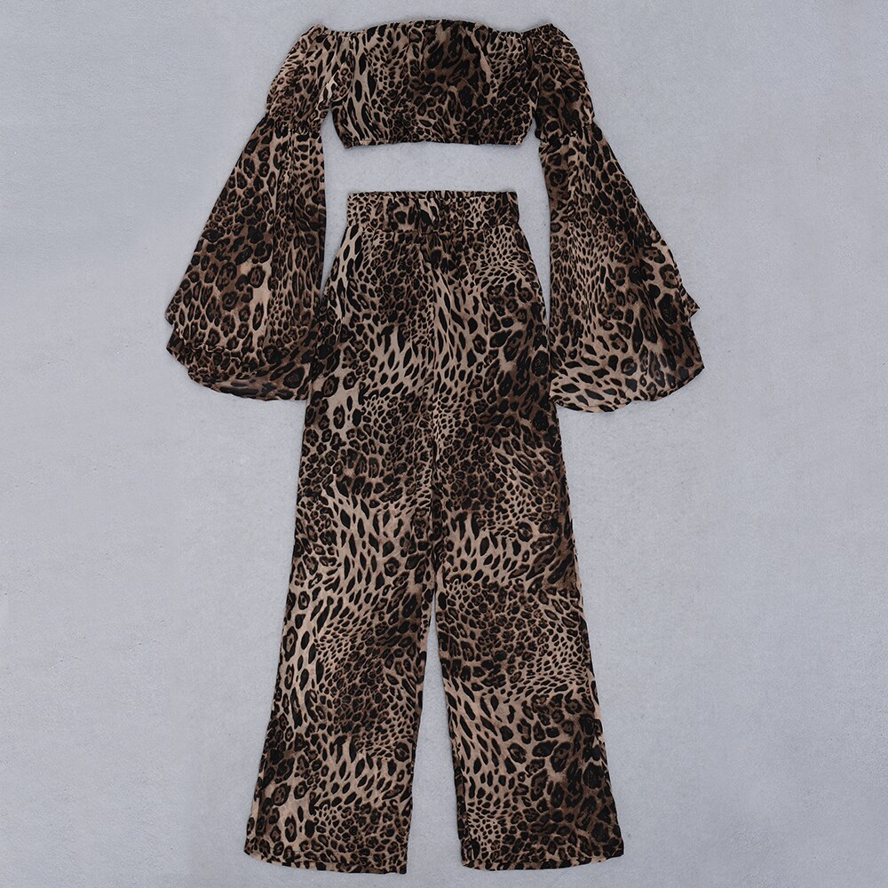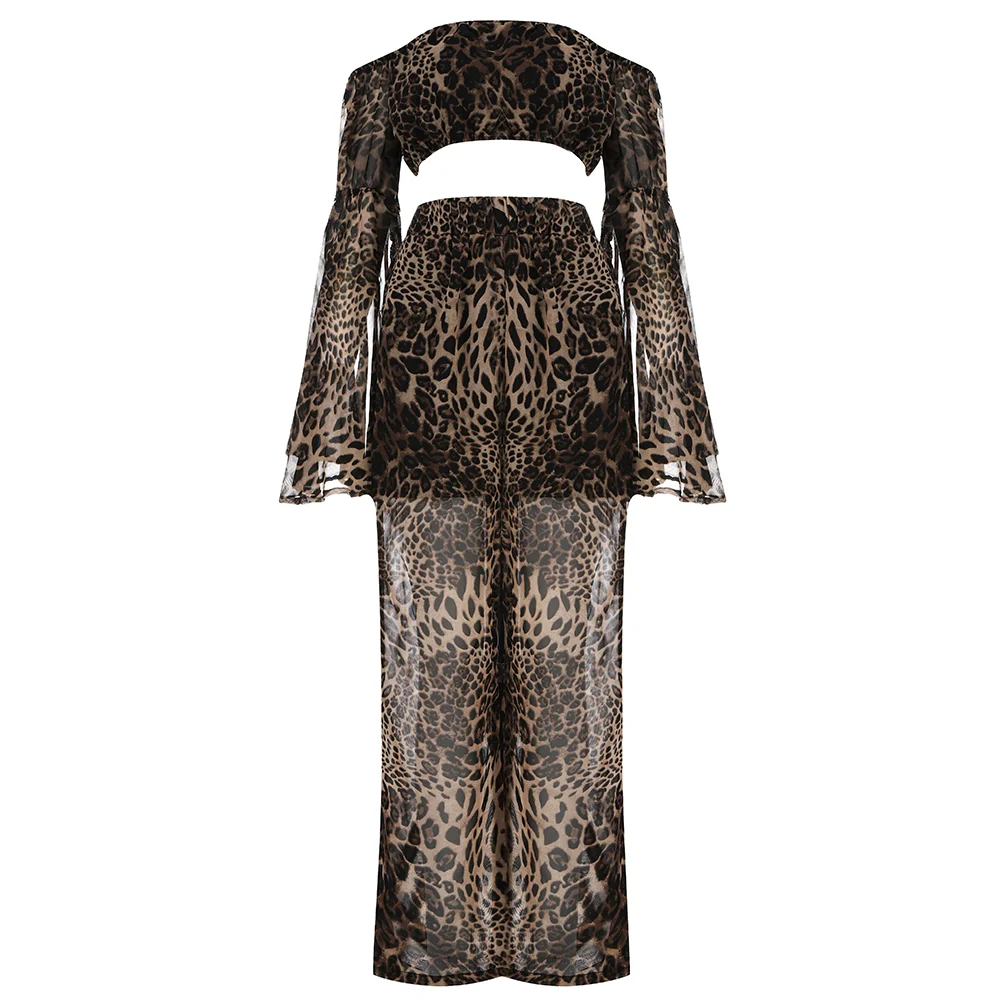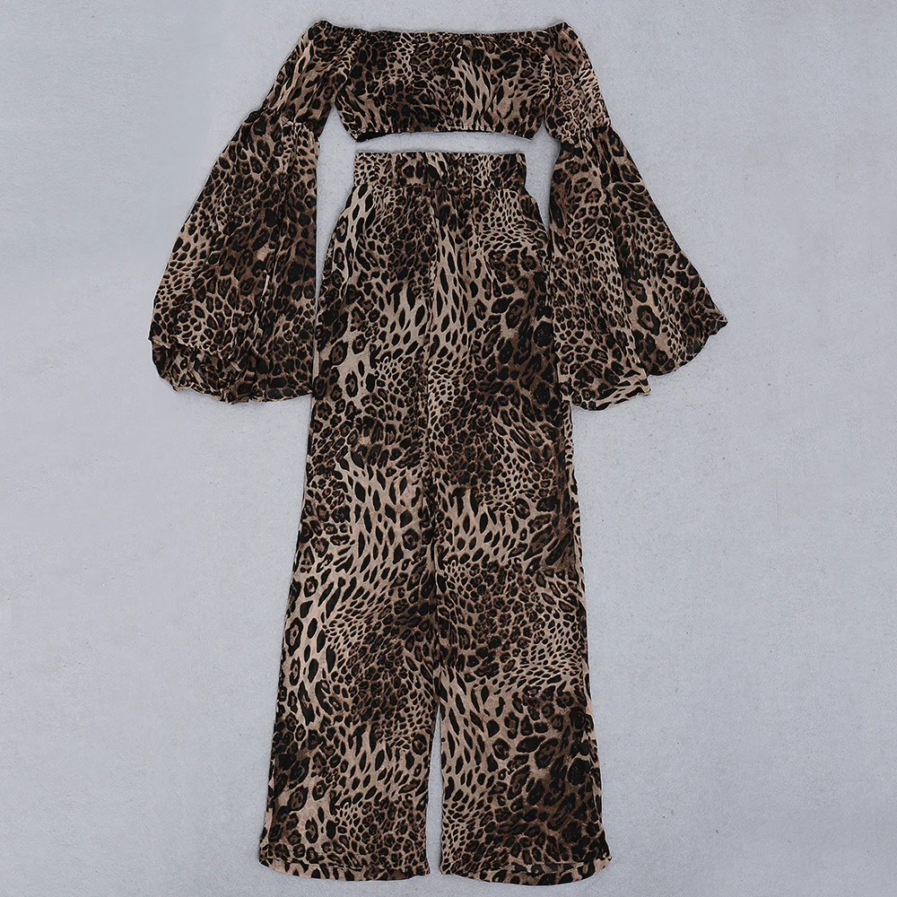2021 New Summer Women Fashion Leopard Lace 2 Two Pieces Sets Sexy Long Sleeve Tops &Full Pants Party Casual Outwear Sets