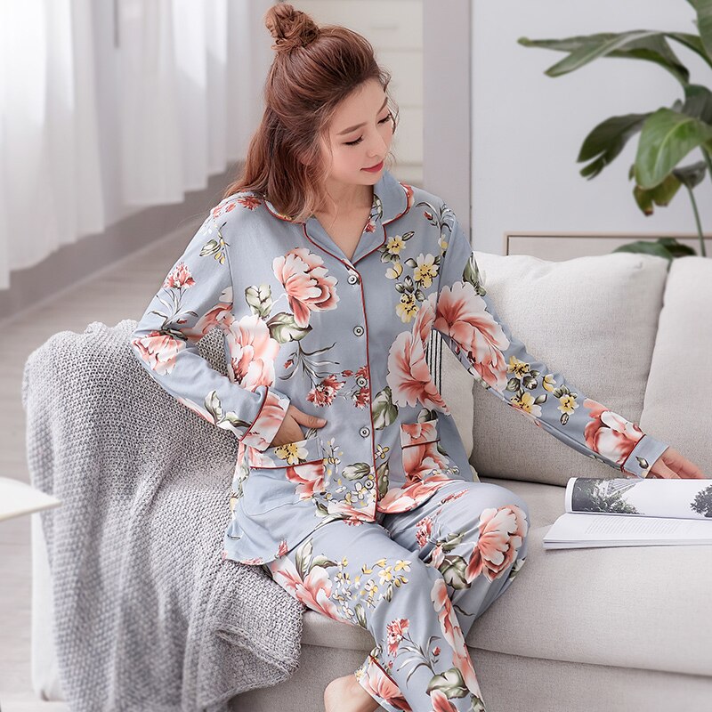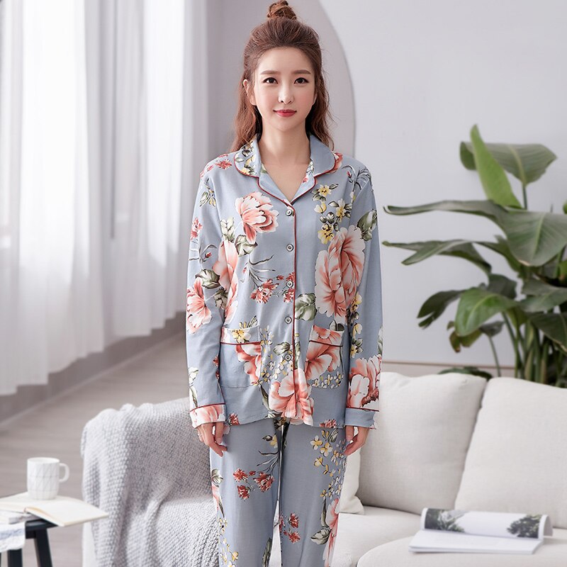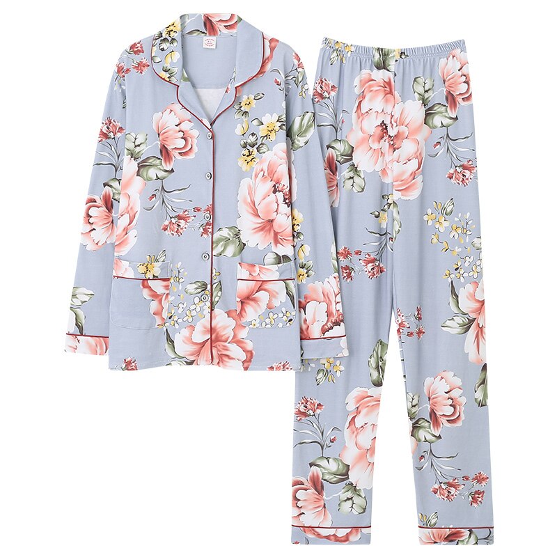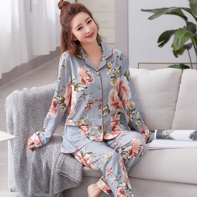 Autumn Winter Women's Pajamas Sets Flower Print Luxury Female Two Pieces Shirts + Pants Nighties Soft Cotton Sleepwear Plus Size