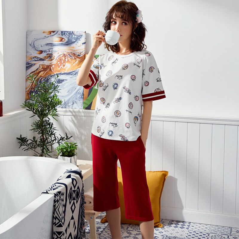 Fruit Print Cute Sweet Women Pajamas Set Soft Short Sleeve O-Neck Pants Lady Home Clothes Summer Female Nightie