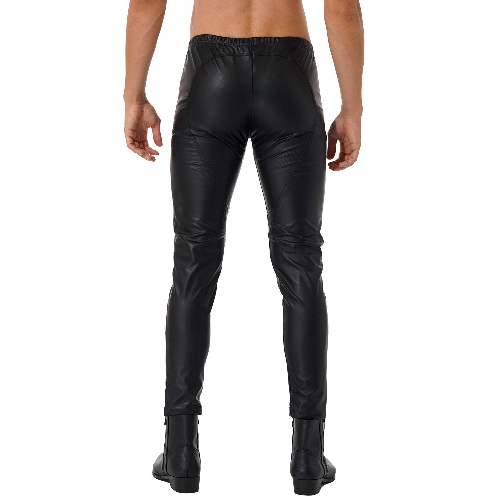 Men Faux Leather Elastic Waistband Skinny Pants Zipper Front Trousers for Nightclub Stage Show.