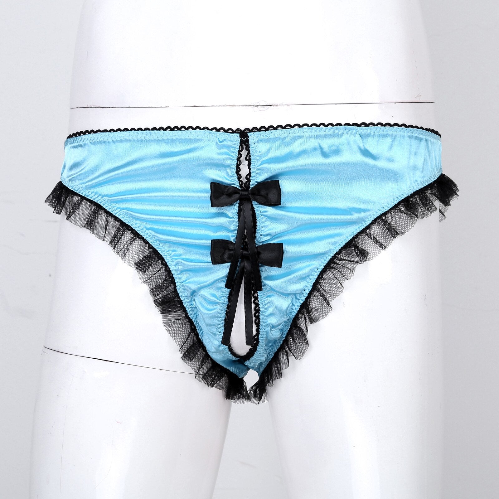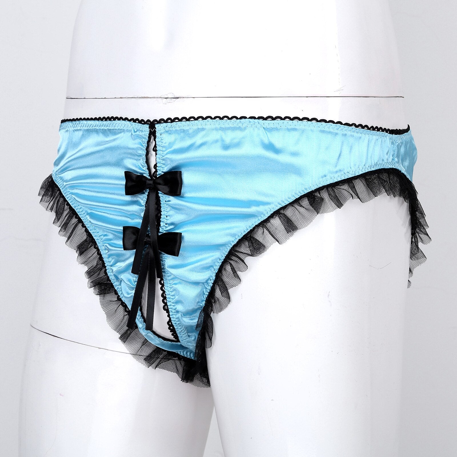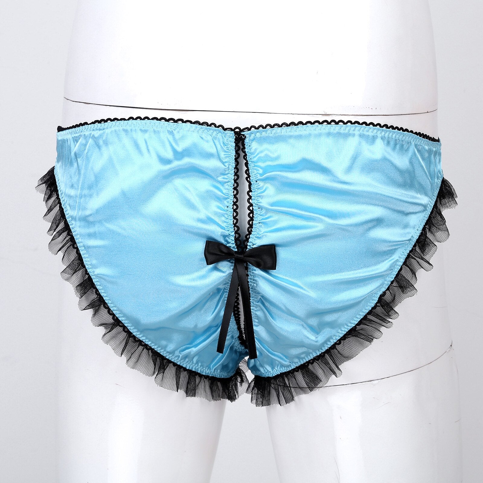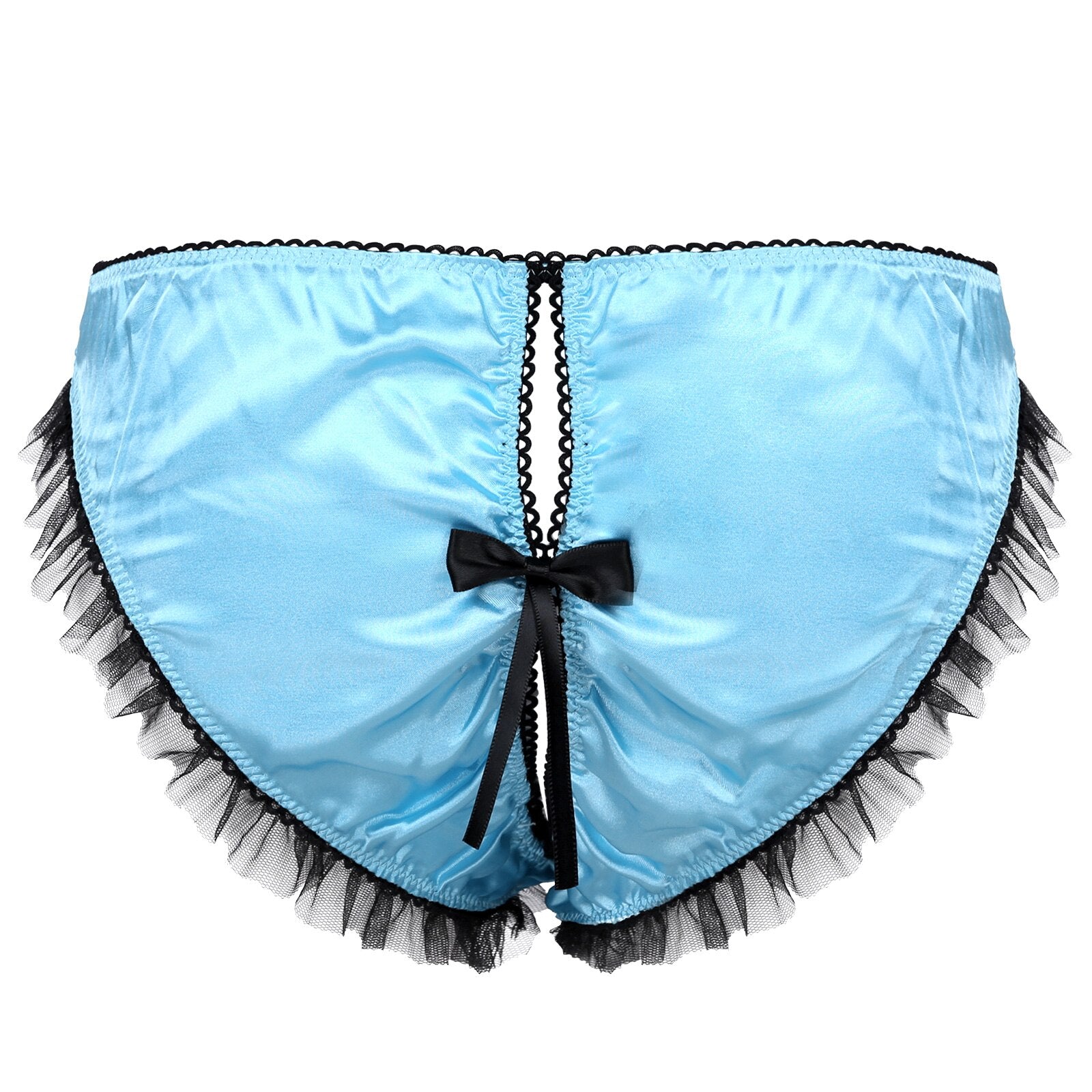 Men’s sissy silky satin mesh trim lingerie underwear, pull on closure.