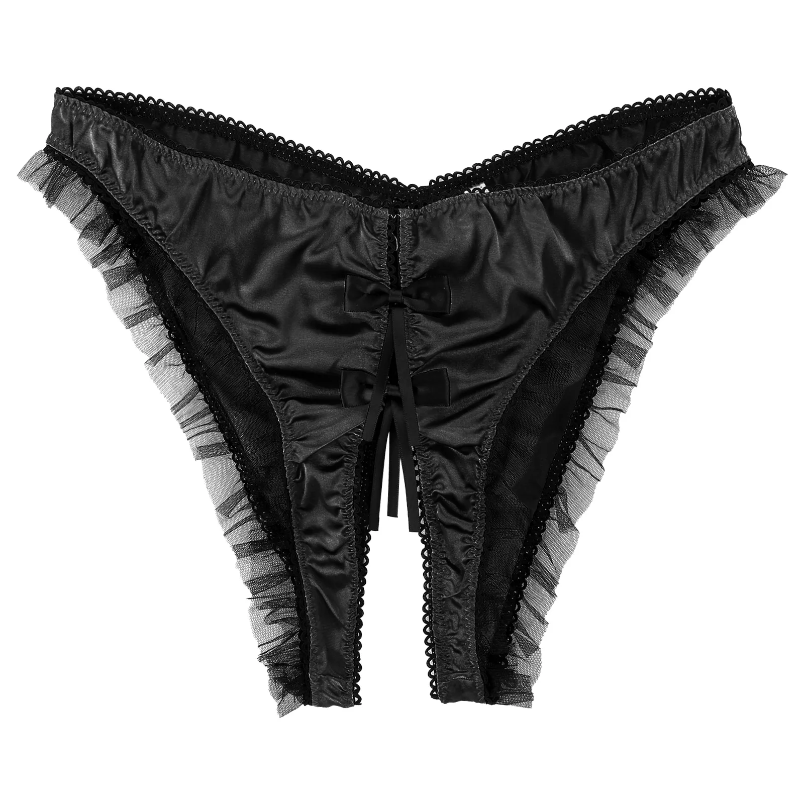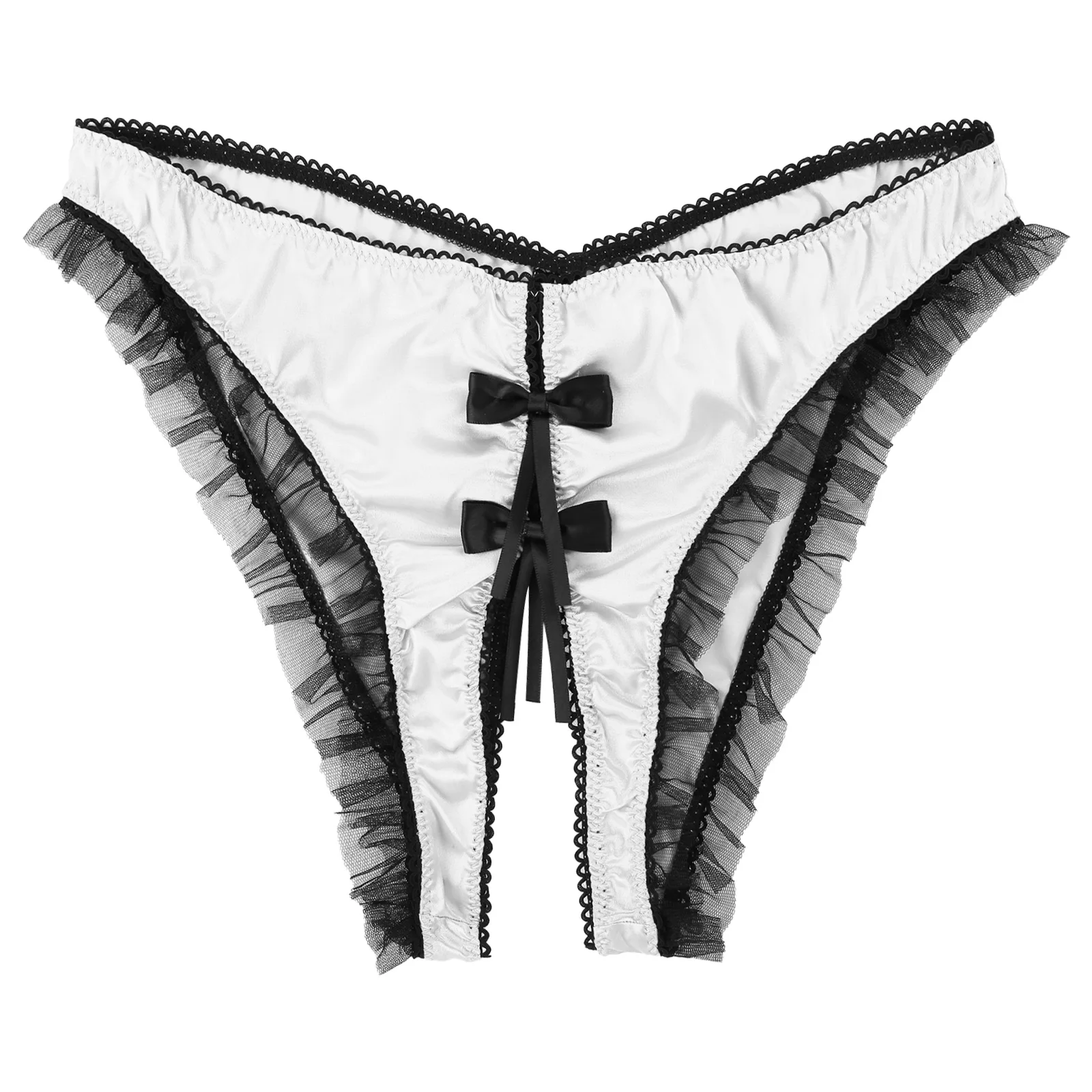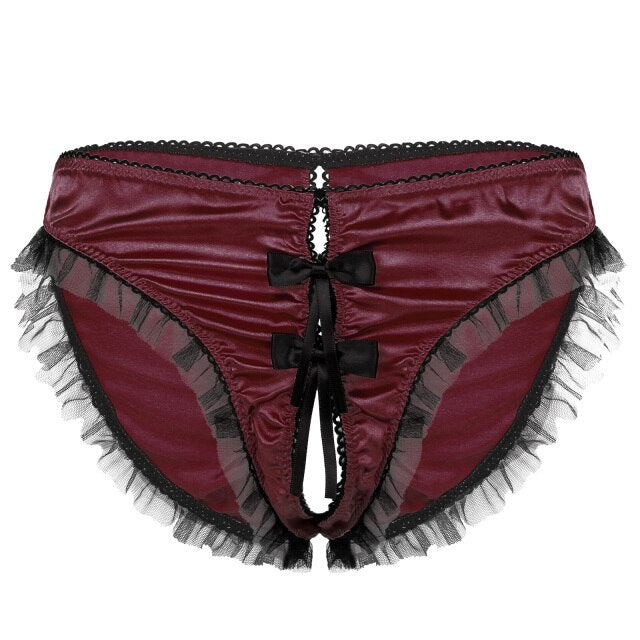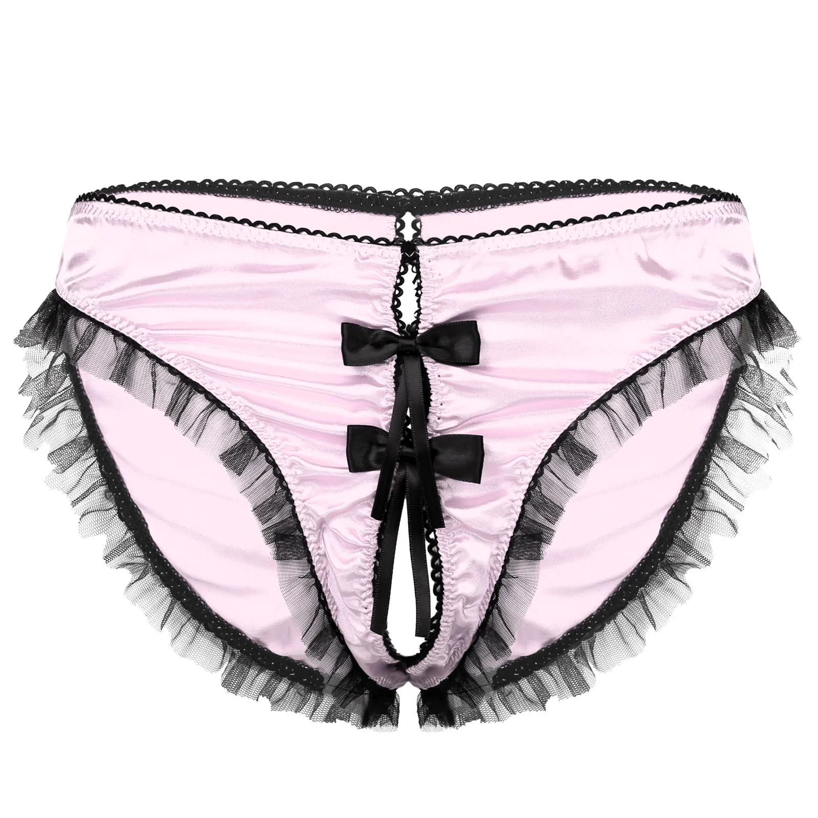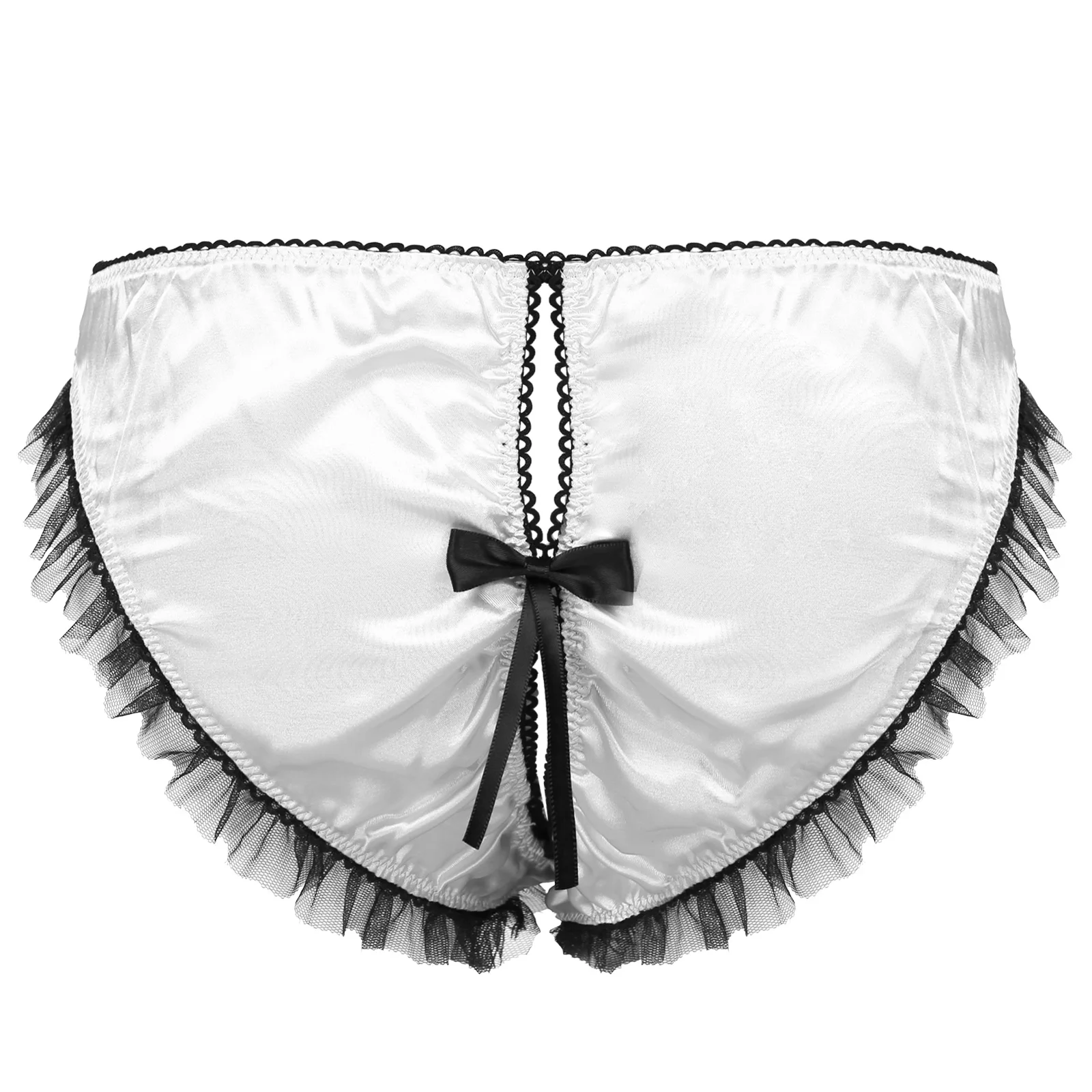 Men’s sissy silky satin mesh trim lingerie underwear, pull on closure.