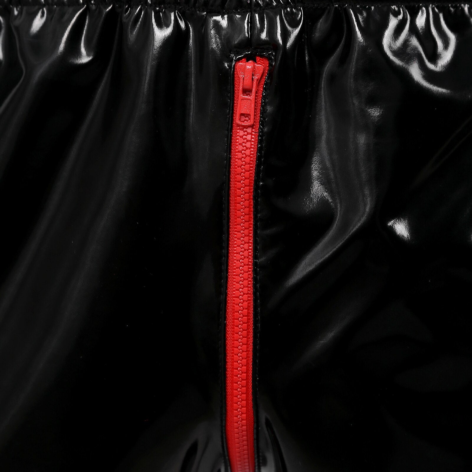 Featuring with glossy appearance, zipper design, elastic waistband for comfy fit.