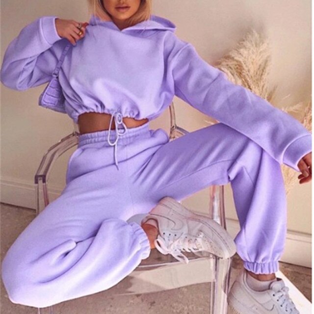 Solid Tracksuit Women Two Piece Set Autumn Clothing Hooded Drawstring Sweatshirt Top Long Pants Suit Casual Women's Sets Outfits